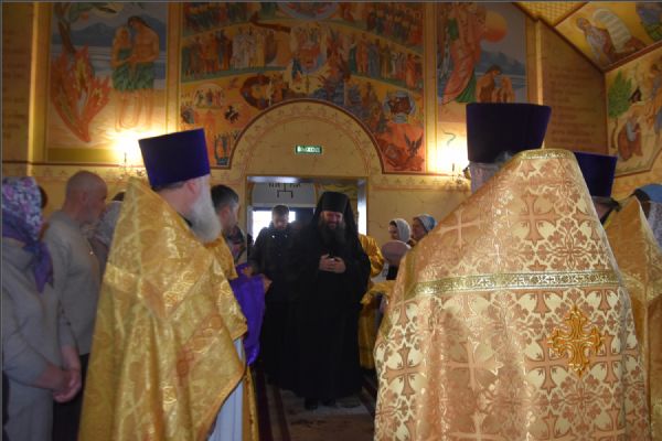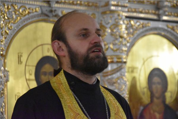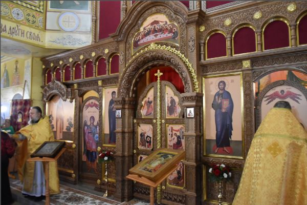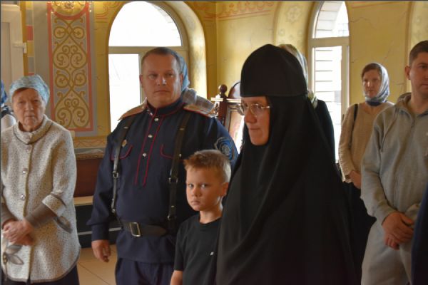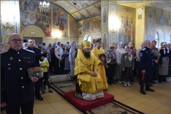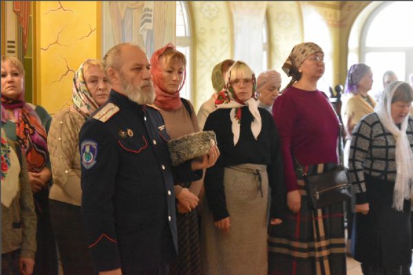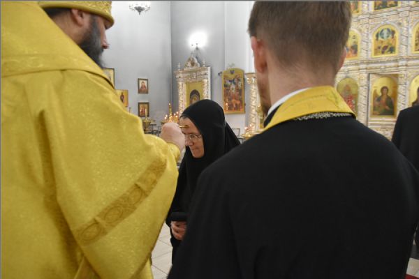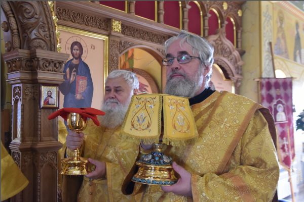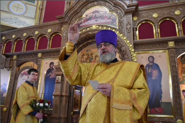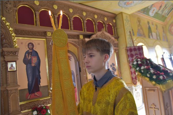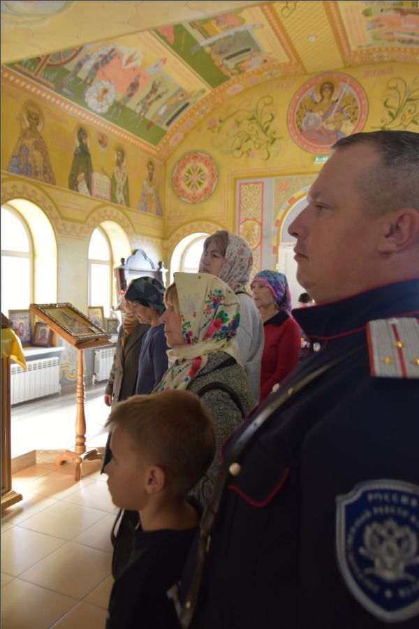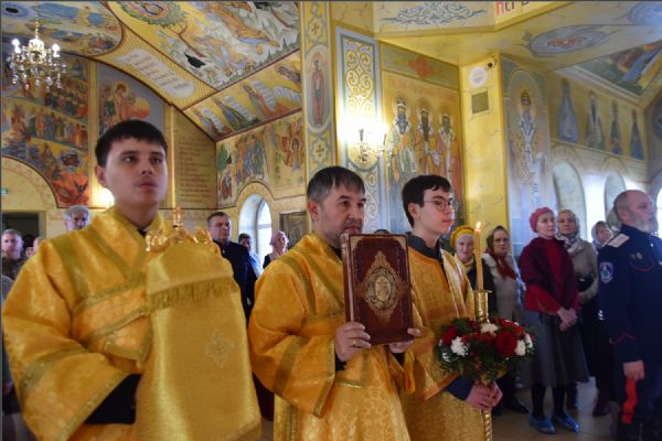 На мирной и сугубой ектениях были вознесены молитвенные прошения о Российском воинстве и о мире. По запричастном стихе проповедь произнёс иерей Василий Федосеев.