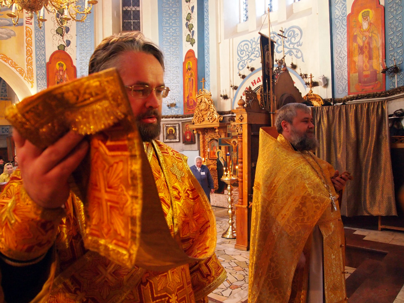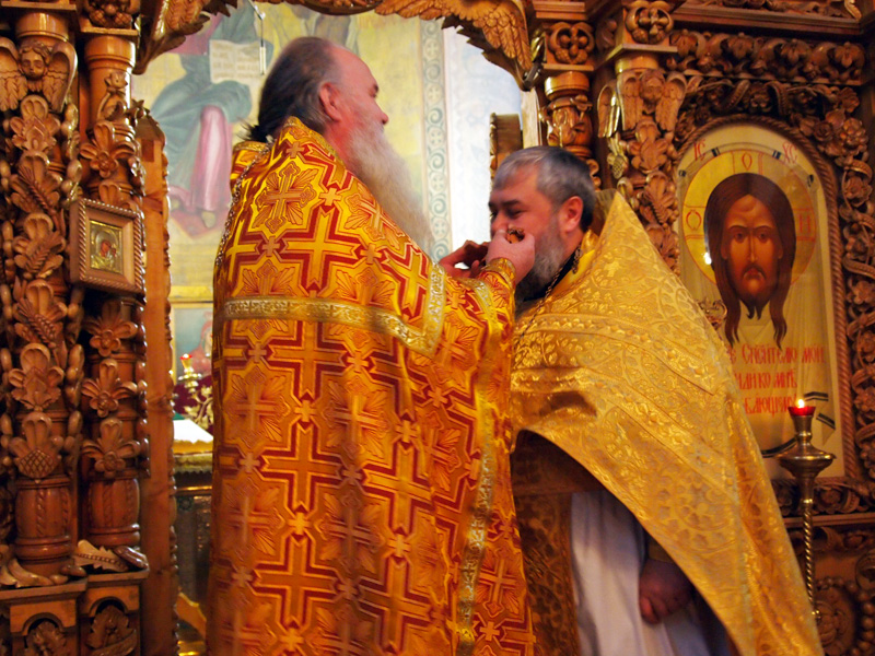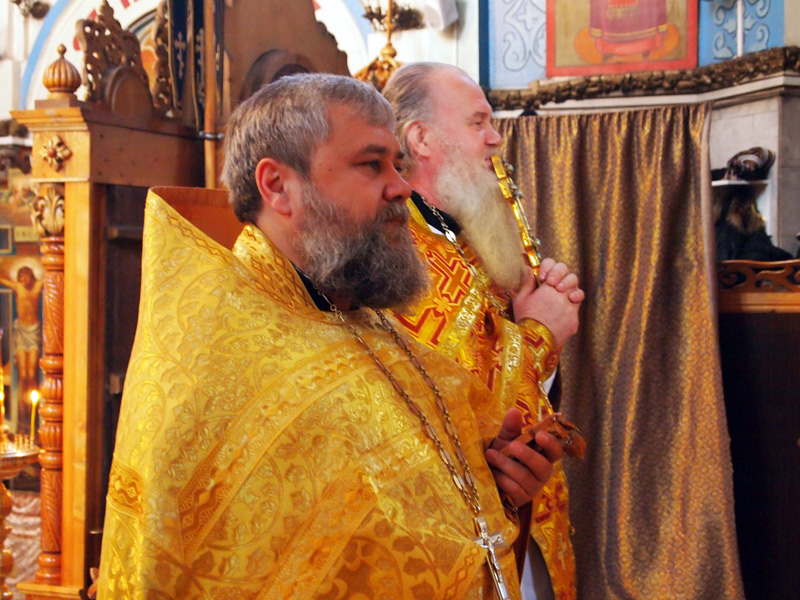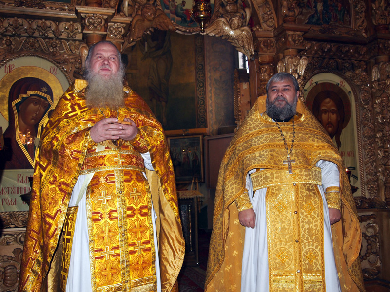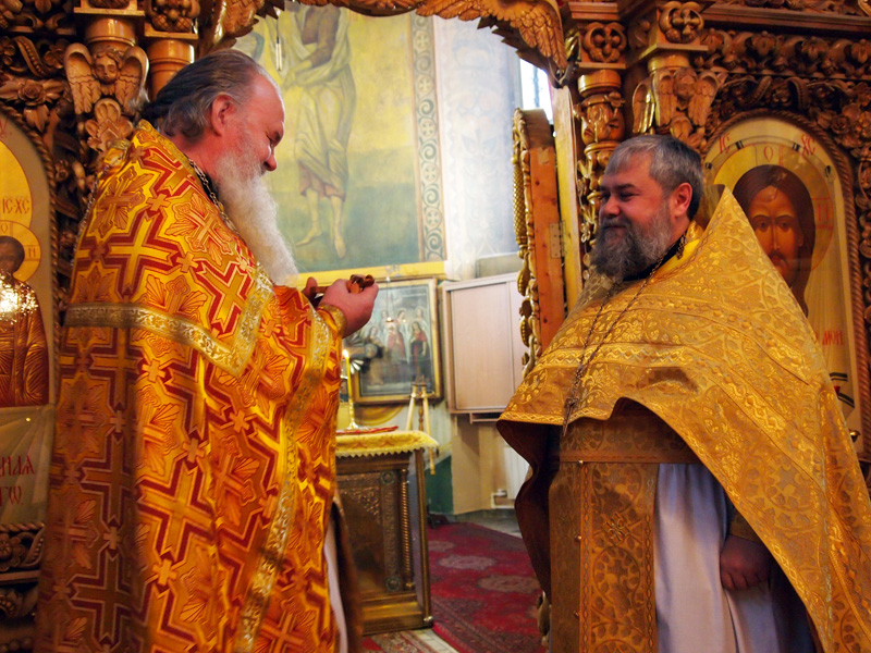 По окончании Литургии именинника поздравил протоиерей Александр Филькин, пожелав ему крепости сил душевных и телесных в несении пастырского служения, и преподнес ему в дар деревянный наперсный крест.