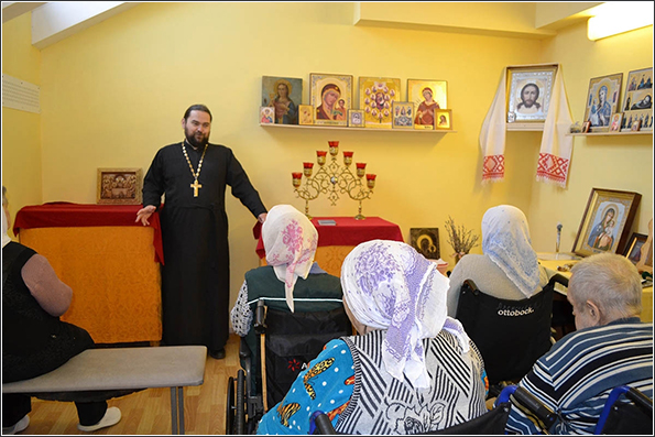 На попечении сестричества также находится и Елабужский дом-интернат для престарелых и инвалидов, на базе которого функционирует православный кружок «Благословение». На очередной встрече с пожилыми людьми отец Илия Кривов вынес на обсуждение отрывок из пятой главы Евангелия от Марка, повествующий об исцелении гадаринского бесноватого: «человек, одержимый нечистым духом, он имел жилище в гробах, и никто не мог его связать даже цепями, потому что многократно был он скован оковами и цепями, но разрывал цепи и разбивал оковы» (Мк. 5, 2-4). В завершении беседы батюшка поделился новостями епархии, напомнил о Всемирном дне памяти жертв ДТП, отмечающемся ежегодно в третье воскресенье ноября, а также ответил на вопросы подопечных социального учреждения.