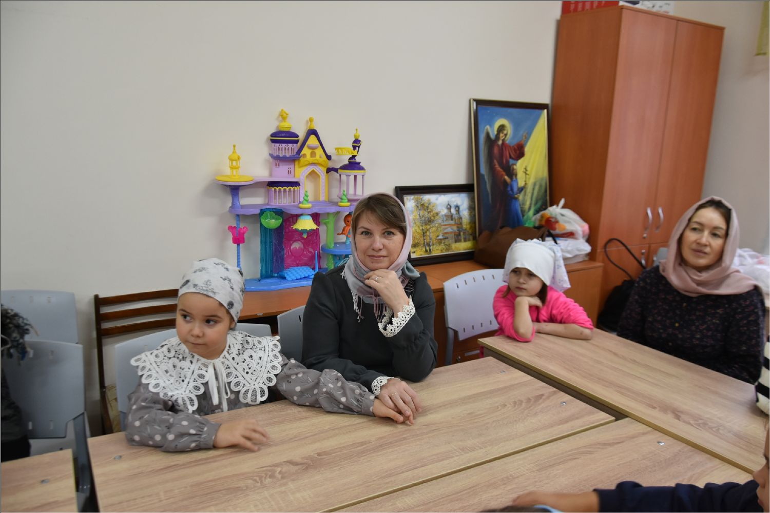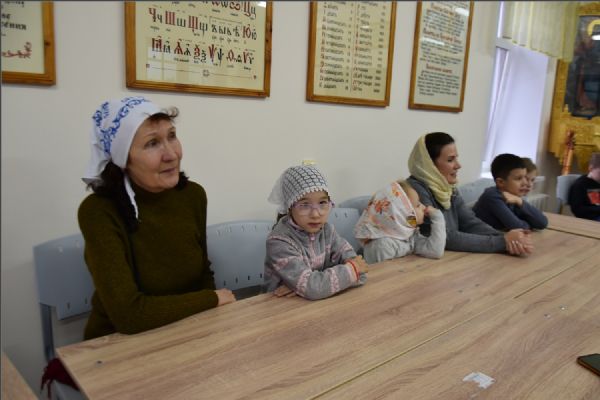 По окончании Божественной литургии воспитанники групп «Веди» и «Глаголь» вместе с педагогом Аленой Александровной поздравляли прихожанок и дарили им открытки со сладостями, после чего состоялось совместное чаепитие.