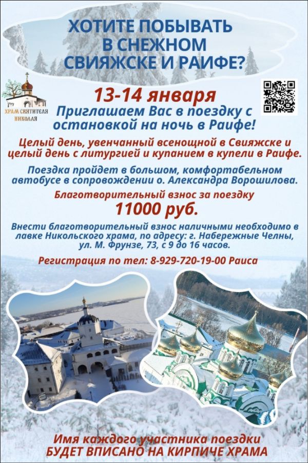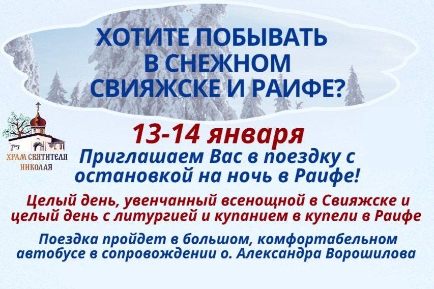 Паломническая служба Никольского храма г. Набережные Челны приглашает провести один чудесный день на острове-граде Свияжске и еще один день в монастырской зимней сказке Раифы! В таких замечательных и теплых даже для зимы местах можно будет покататься на санях, запряженных лошадьми, полюбоваться ледяными скульптурами, покататься на коньках по катку.