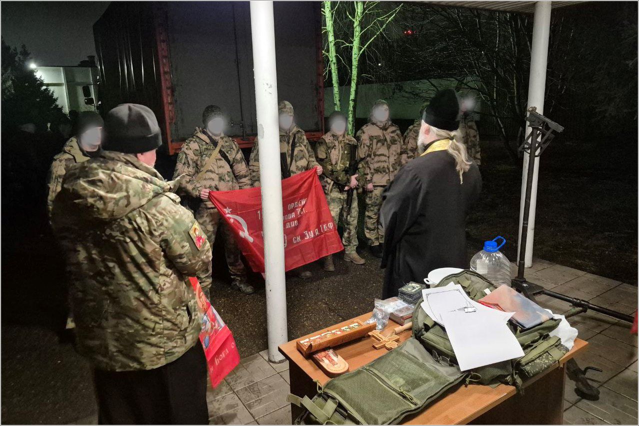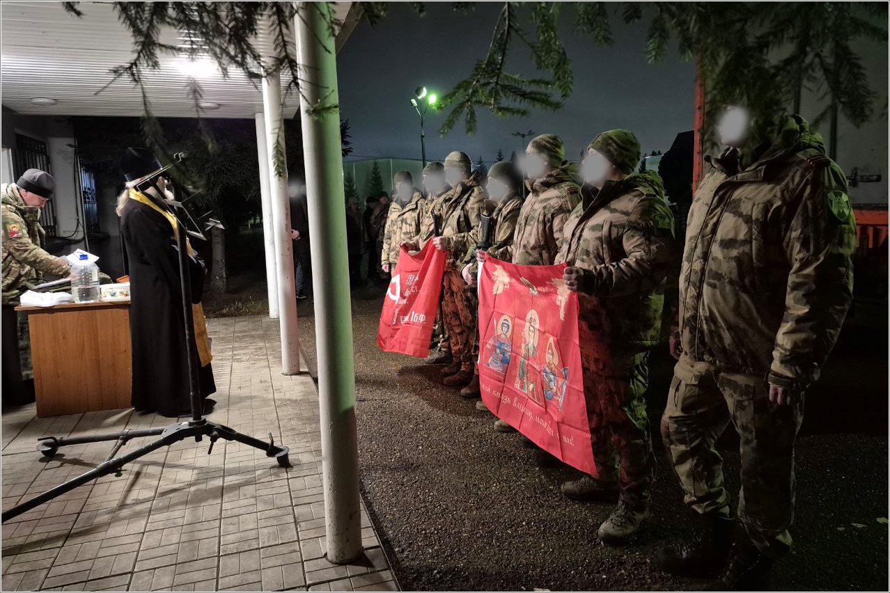 Священники благословили воинов, сказали им напутственные слова, раздали шевроны с изображением Спасителя и святого Александра Невского, каждого бойца окропили святой водой и помазали освященным маслом.