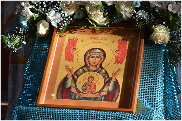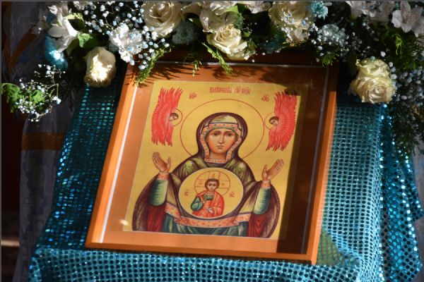 «Икона Божией Матери «Знамение» — особая, удивительная. Знамение Божией Матери — это знак победы над злом во имя мира, единства и добра. Богородица, воздевая руки к небу, непрерывно за нас молится, а в медальоне — Ее младенец, Господь наш Иисус Христос. Этот образ еще называют «Воплощение»: через Ее пречистую плоть сам Бог сошел на землю. Он стал одним из нас, чтобы быть рядом с нами, так же страдать, вместе с нами умирать и воскресать, побеждать зло. Все это идет через Его Пречистую Матерь, которая за нас молится.