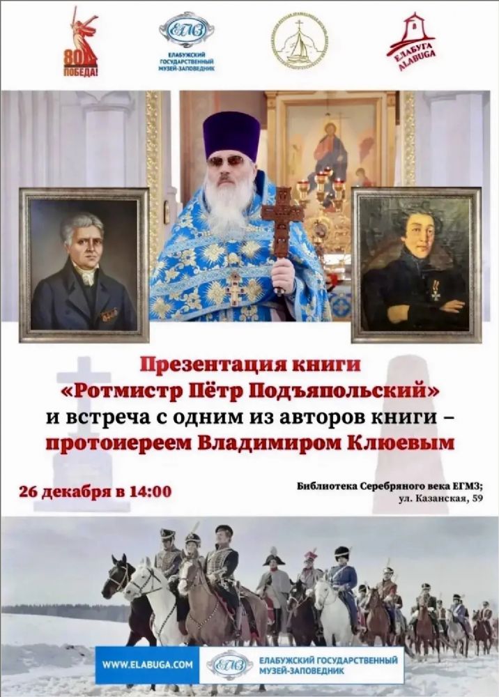 26 декабря 2025 года в 14:00 в Библиотеке Серебряного века Елабужского государственного музея-заповедника, по благословению епископа Набережночелнинского и Елабужского Гавриила состоится презентация книги о Герое Отечественной войны 1812 года «Ротмистр Пётр Подъяпольский».