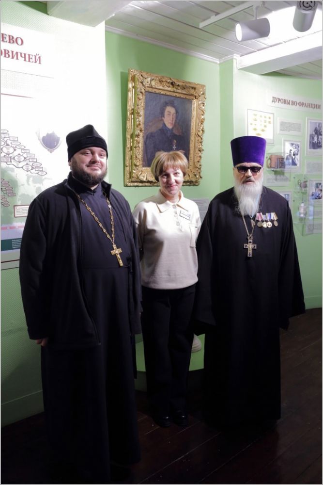 Далее протоиерей Владимир Клюев посетил музей-усадьбу Н.А. Дуровой на Московской улице, 123. Именно в этом доме прошли последние годы жизни удивительной женщины. Экскурсию провела заведующая музеем, кандидат исторических наук Ольга Александровна Айкашева. Она с глубоким знанием всех деталей биографии Надежды Андреевны, с очевидной душевной теплотой и любовью рассказала о жизни, подвигах и литературном творчестве Дуровой, чей музей с 1993 года бережно хранит память об этой уникальной личности.
