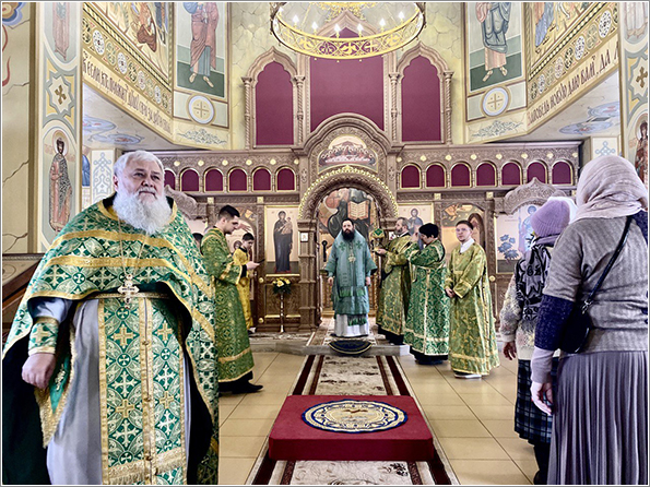 На мирной и сугубой ектениях были вознесены молитвенные прошения о Российском воинстве и молитва о мире. Проповедь по запричастном стихе произнес иерей Василий Федосеев.