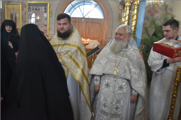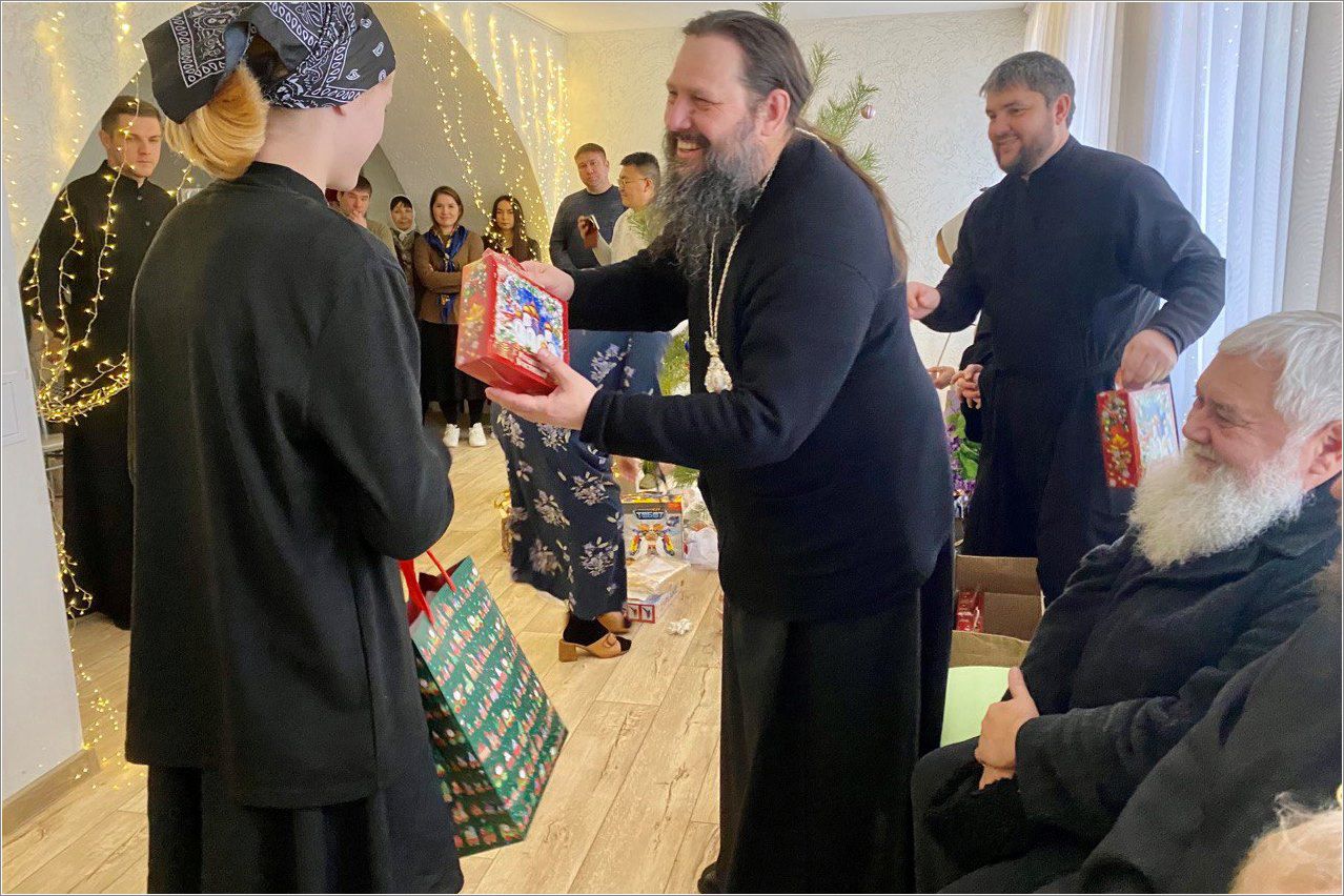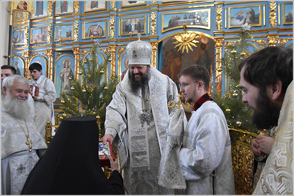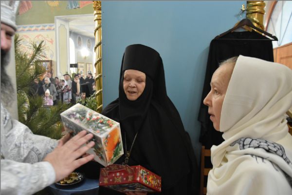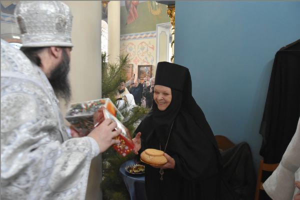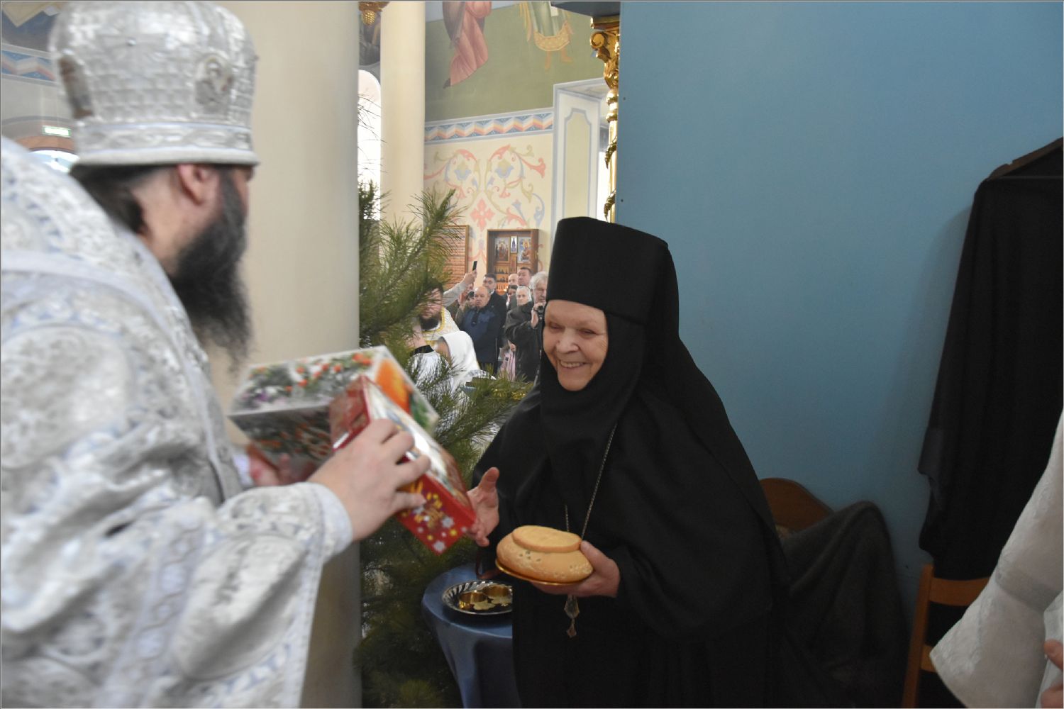 Епископ Гавриил вручил игумении Вере богослужебную просфору и Рождественские подарки. Архипастырь также поздравил всех насельниц обители и вручил им сладкие подарки.