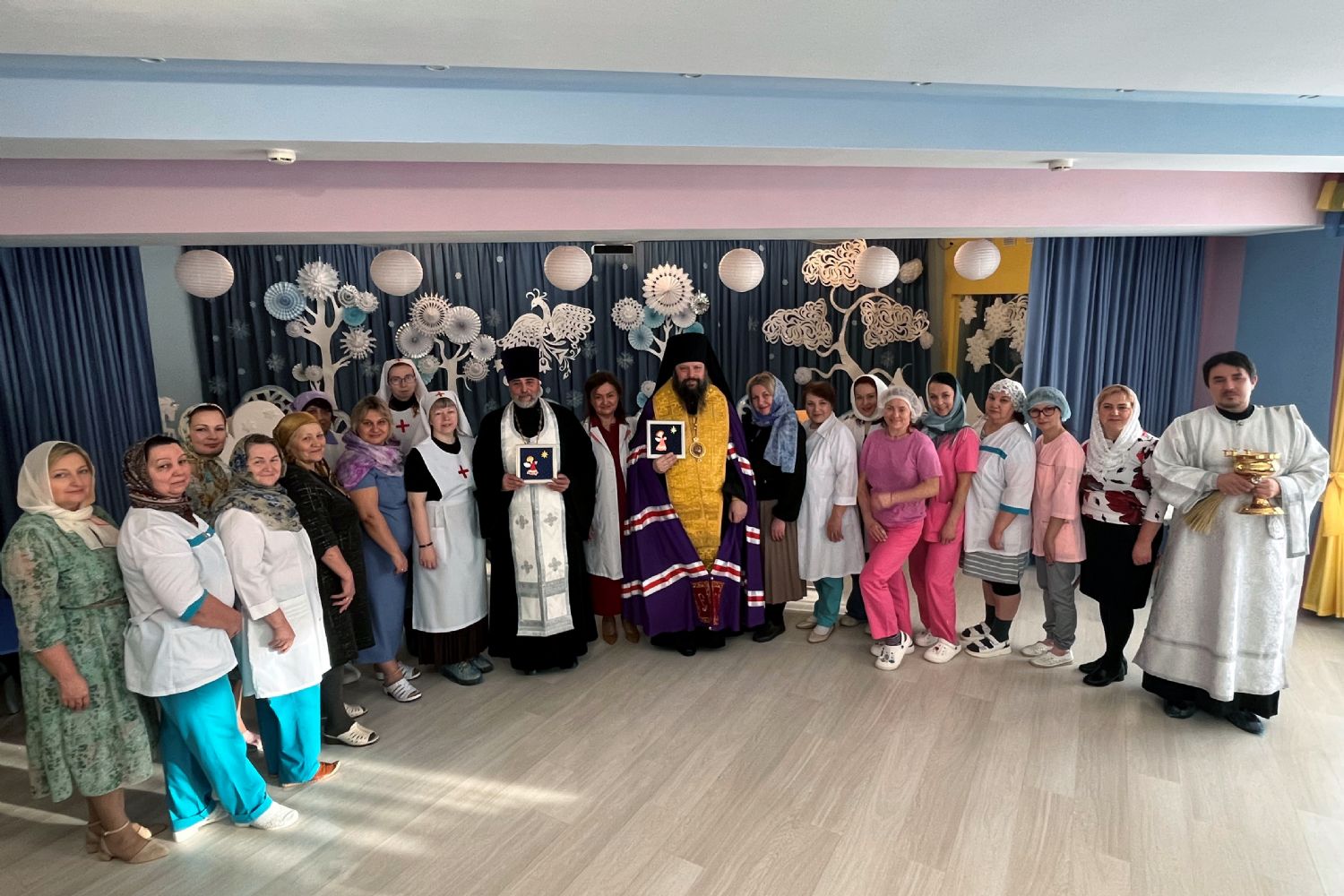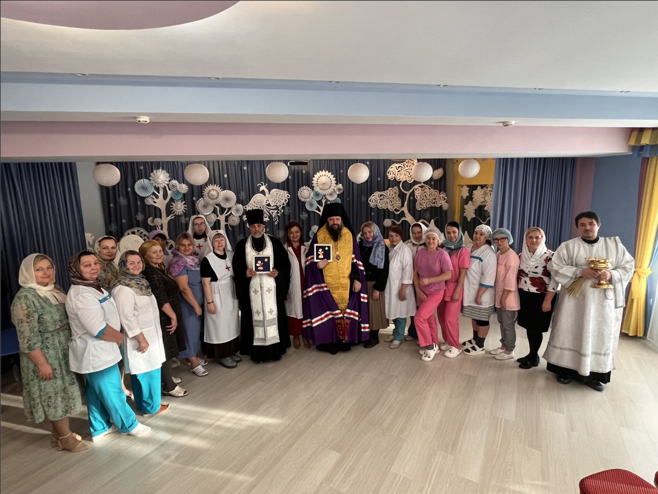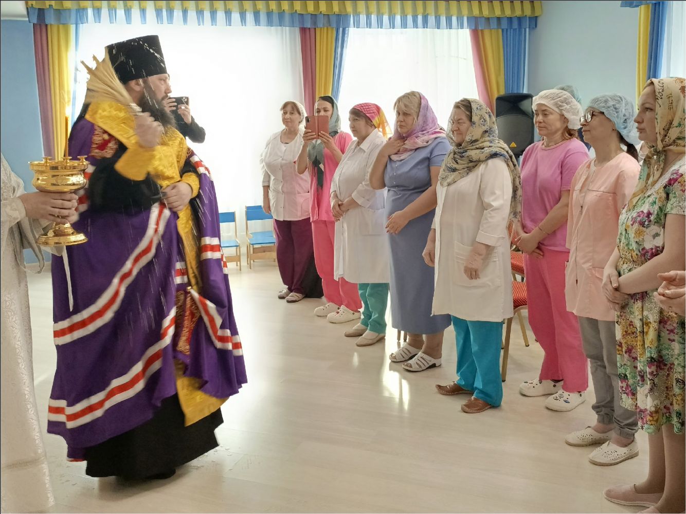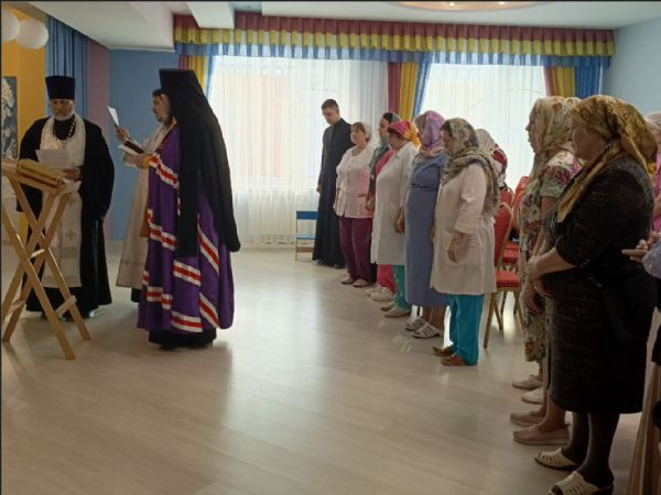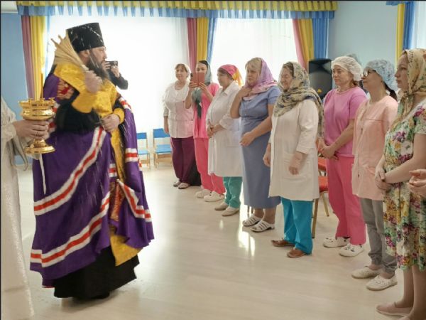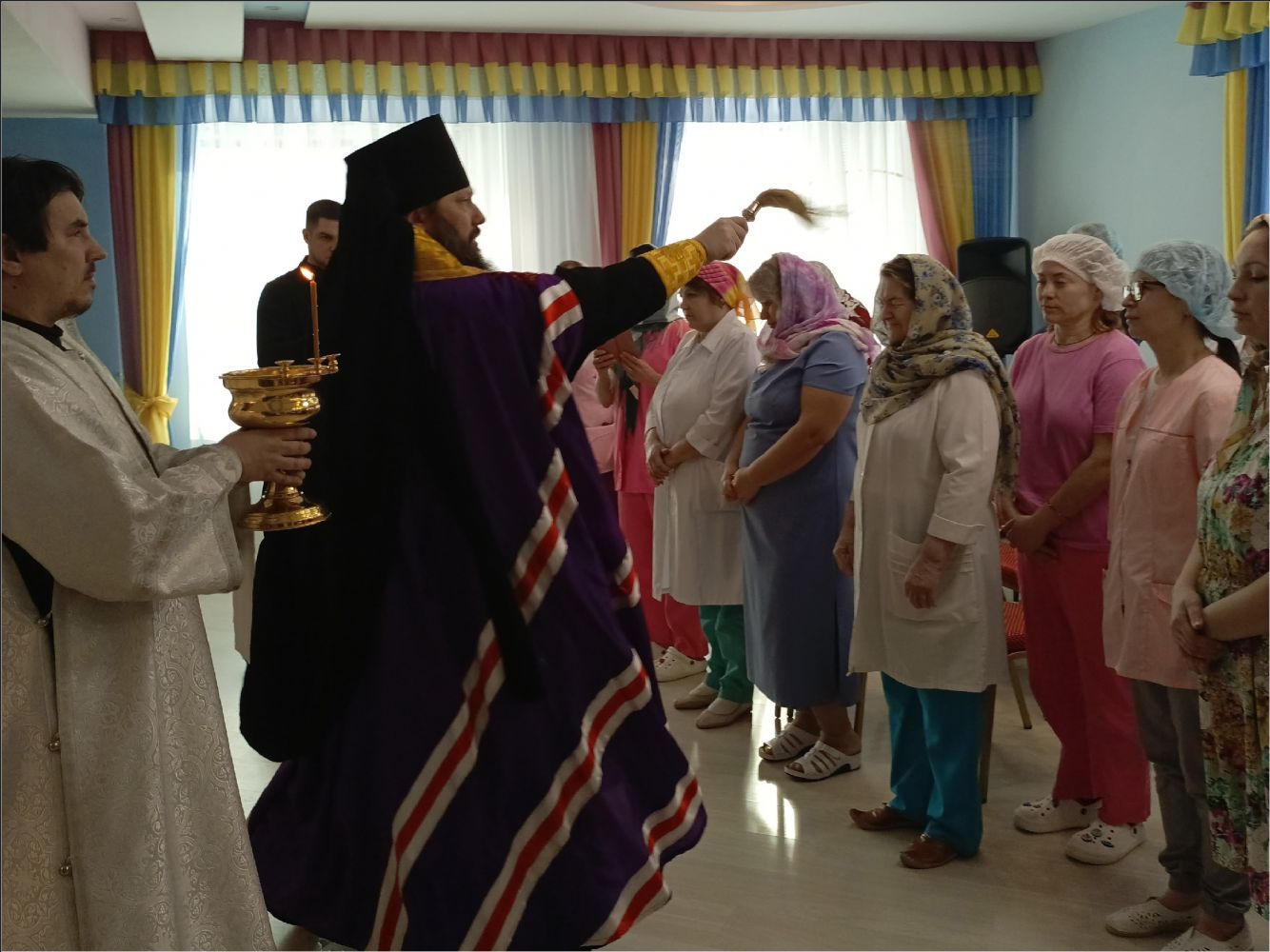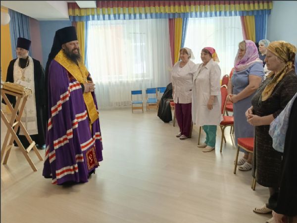 Владыку сопровождал настоятель храма Архистратига Божия Михаила поселка Круглое Поле иерей Виктор Кобзов, который уже много лет окормляет специализированное учреждение, диакон Дмитрий Русин и руководитель социального отдела Набережночелнинской епархии Ольга Шевелева.