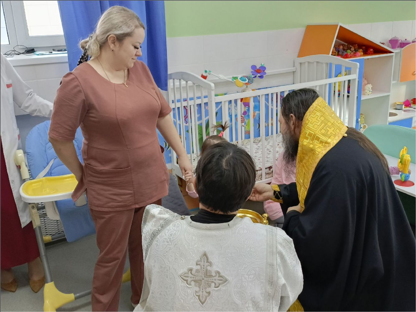 Правящий архиерей совершил молитву, провел беседу с сотрудниками, окропил присутствующих Крещенской водой, пообщался с детишками Дома ребенка, подарил сладкие подарки и книжки.
