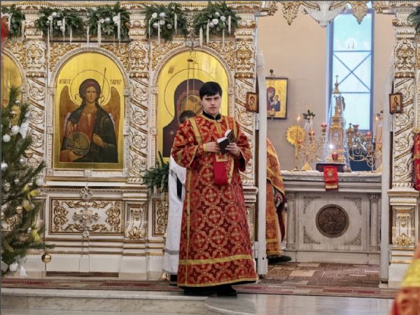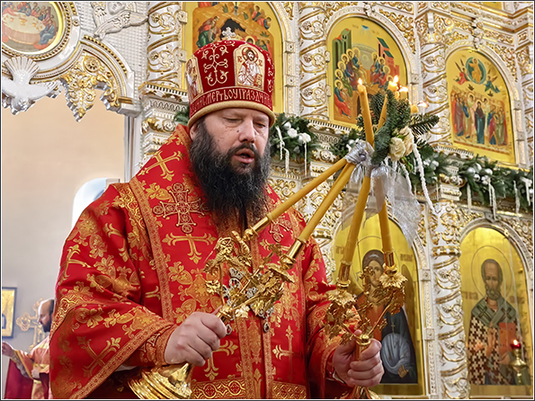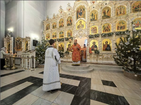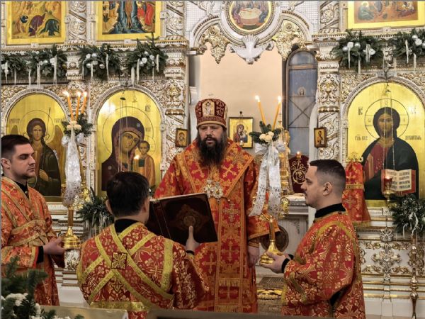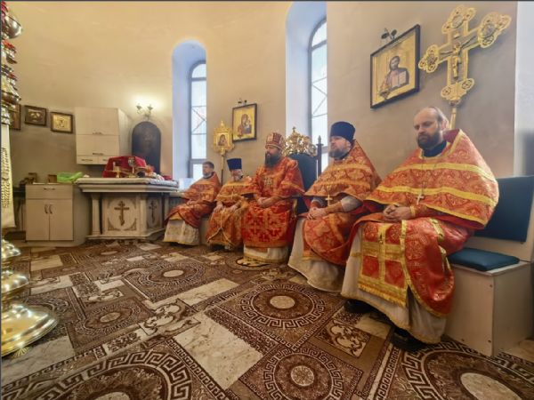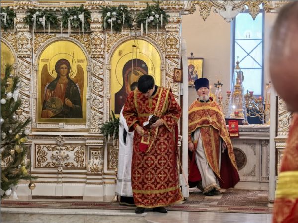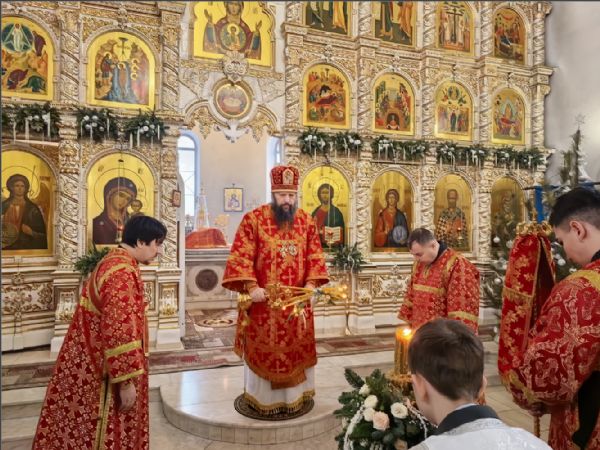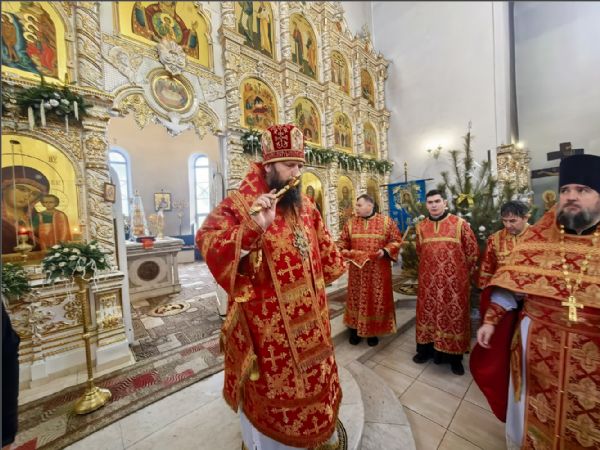 Его Преосвященству сослужили клирики Казанско-Богородицкого храма иерей Алексий Носов и иерей Иоанн Можаев и клирик Свято-Вознесенского кафедрального собора иерей Сергий Иноземцев. Диаконский чин возглавил протодиакон Дмитрий Половников.