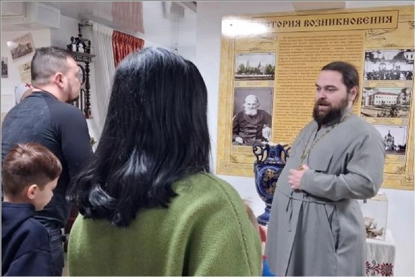 Батюшка ознакомил взрослых и юных посетителей с историко-культурными экспонатами музея. Музей разделён на тематические зоны: левая часть посвящена истории обители со времени основания до второй половины XX века, правая часть представляет период возрождения монастыря, которое началось в 1993 году, в центре расположены атрибуты алтаря, с помощью которых совершается главная служба — Божественная литургия.