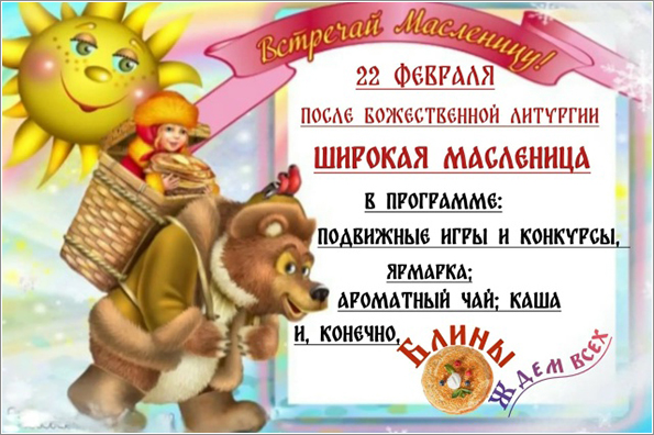 В преддверии Великого поста, в Сырную седмицу (Масленицу) и в Прощёное воскресенье, приходы Набережных Челнов приглашают верующих и всех желающих принять участие в праздничных мероприятиях. Вас ждут ярмарки, конкурсы, народные гуляния и тёплые встречи в кругу прихожан.