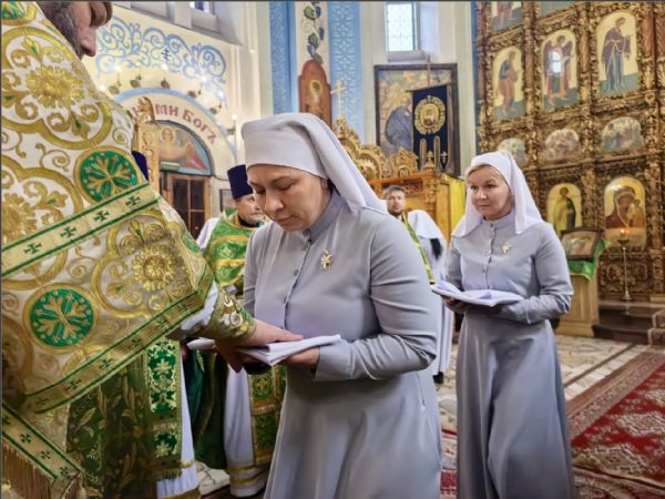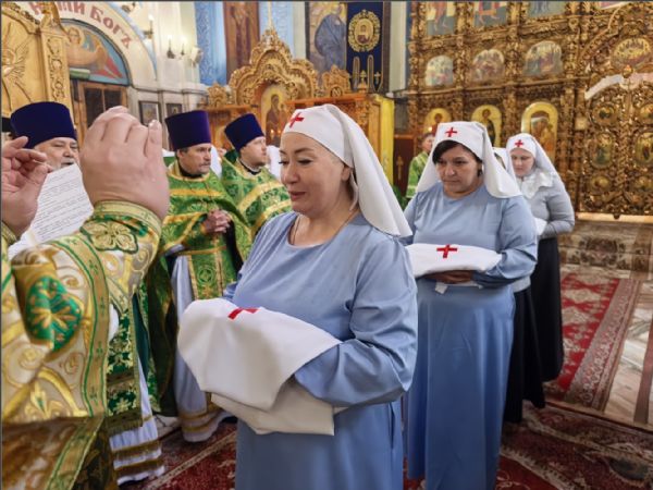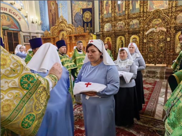 После облачения архиерея, епископ Гавриил совершил молебное пение с чтением молитв, окропил одежды сестрер милосердия и посвятил в сестры, братья и кандидатов в сестры милосердия для трех сестричеств Набережночелнинской епархии.