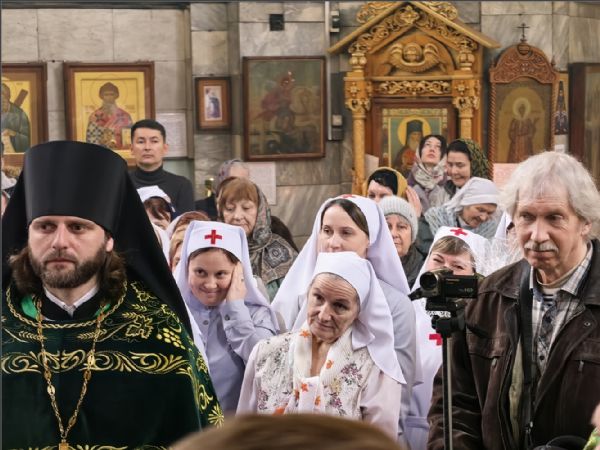 «Дорогой, Владыко! Каждое Ваше богослужение — большой праздник для сестер и братьев. Мы к нему готовимся, переживаем, Спасибо за Ваши добрые наставления и молитвы о нас. Мы всегда помним, что встали на путь служения ближним, чтобы и самим стать лучше. Вы же даете нам такую возможность, указываете нам путь любви и покаяния», — обратилась к правящему архиерею старшая сестра милосердия сестричества в честь преподобного Серафима Саровского Ольга Шевелева.