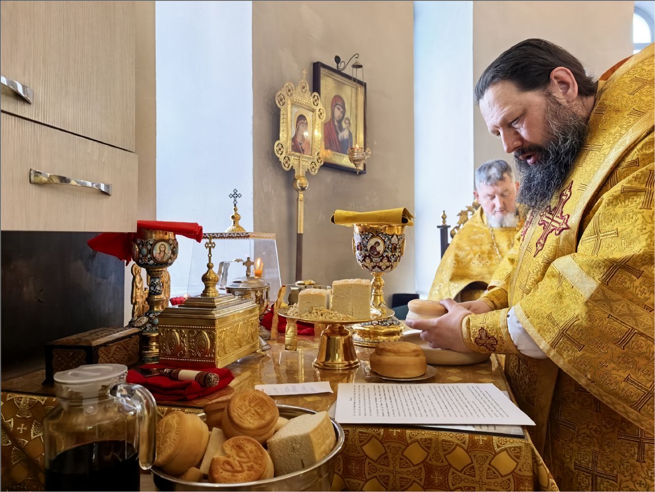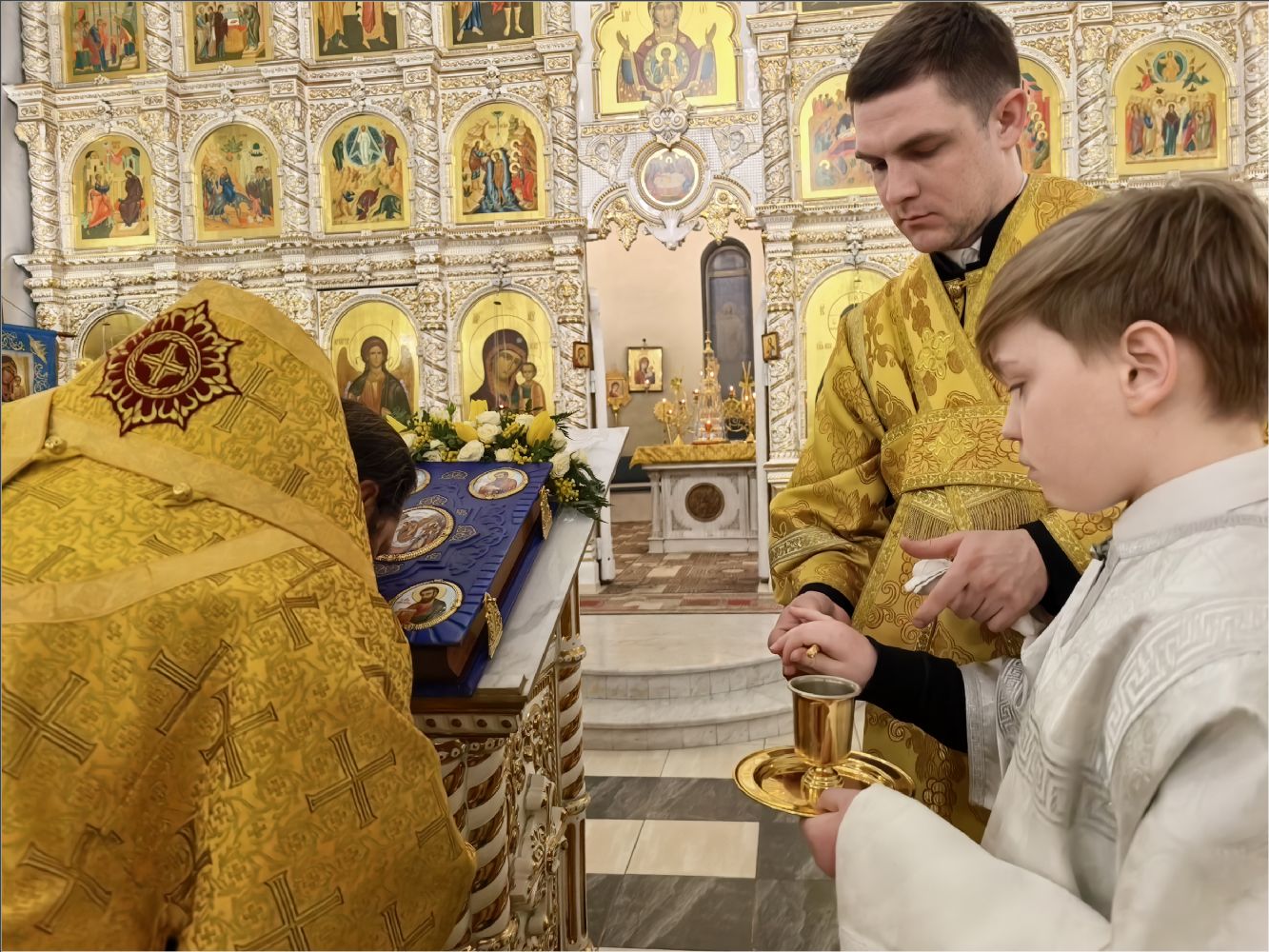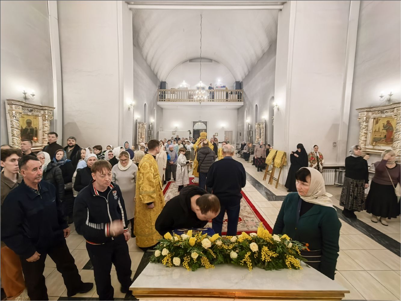На мирной и сугубой ектениях были вознесены молитвы о Российском воинстве и о мире. По запричастном стихе проповедь произнёс иерей Алексий Носов. В своей речи священник коснулся темы покаяния, духовного обновления и значения поста как времени особого молитвенного труда и самосовершенствования.