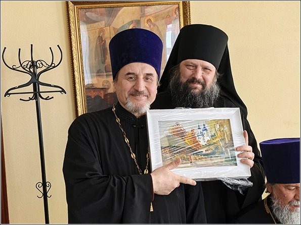 Перед началом собрания архипастырь поздравил иерея Владимира Забалуева с 60-летием и вручил ему картину с изображением Никольского собора в Елабуге.