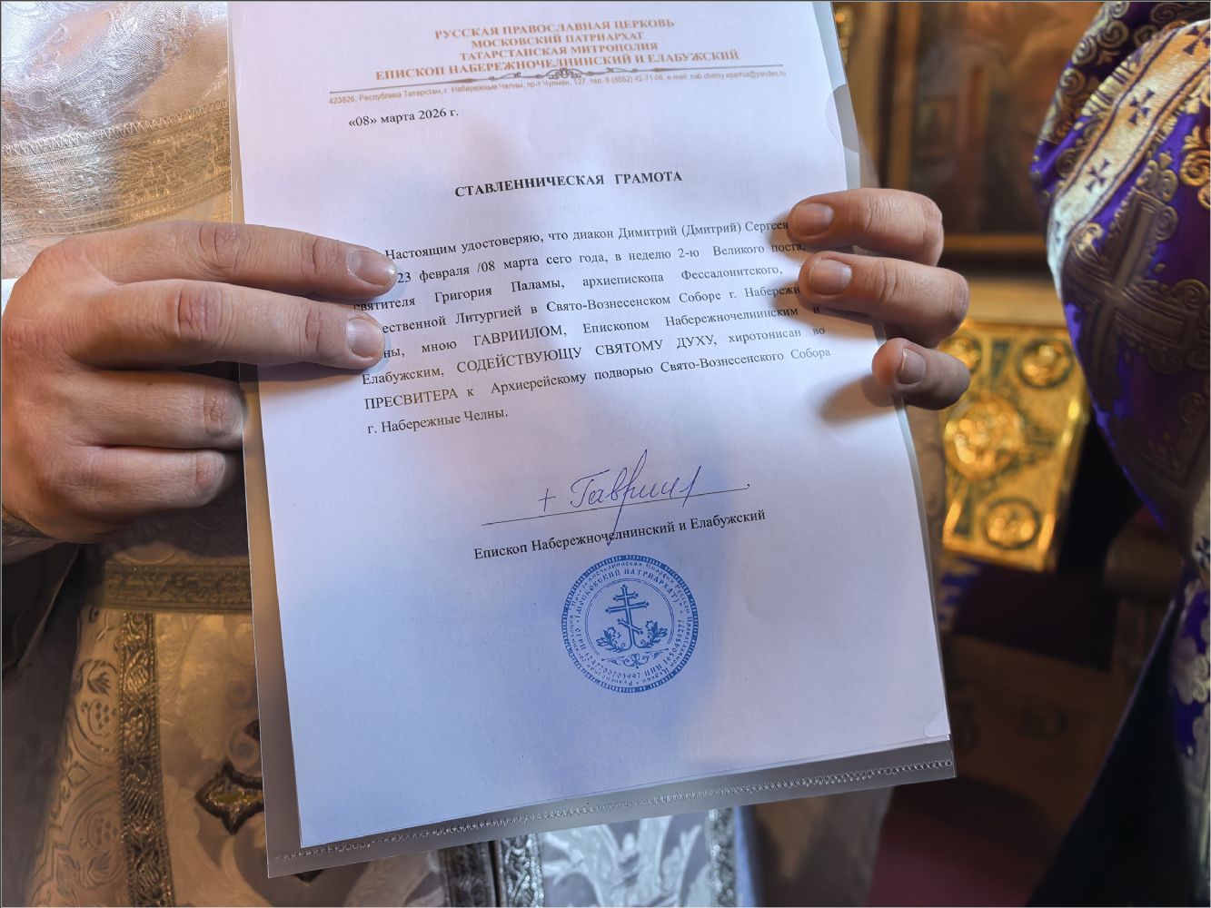 8 марта 2026 года, в Неделю вторую Великого поста, день памяти святителя Григория Паламы, епископ Набережночелнинский и Елабужский Гавриил по Великом входе совершил хиротонию диакона Дмитрия Русина в пресвитера.