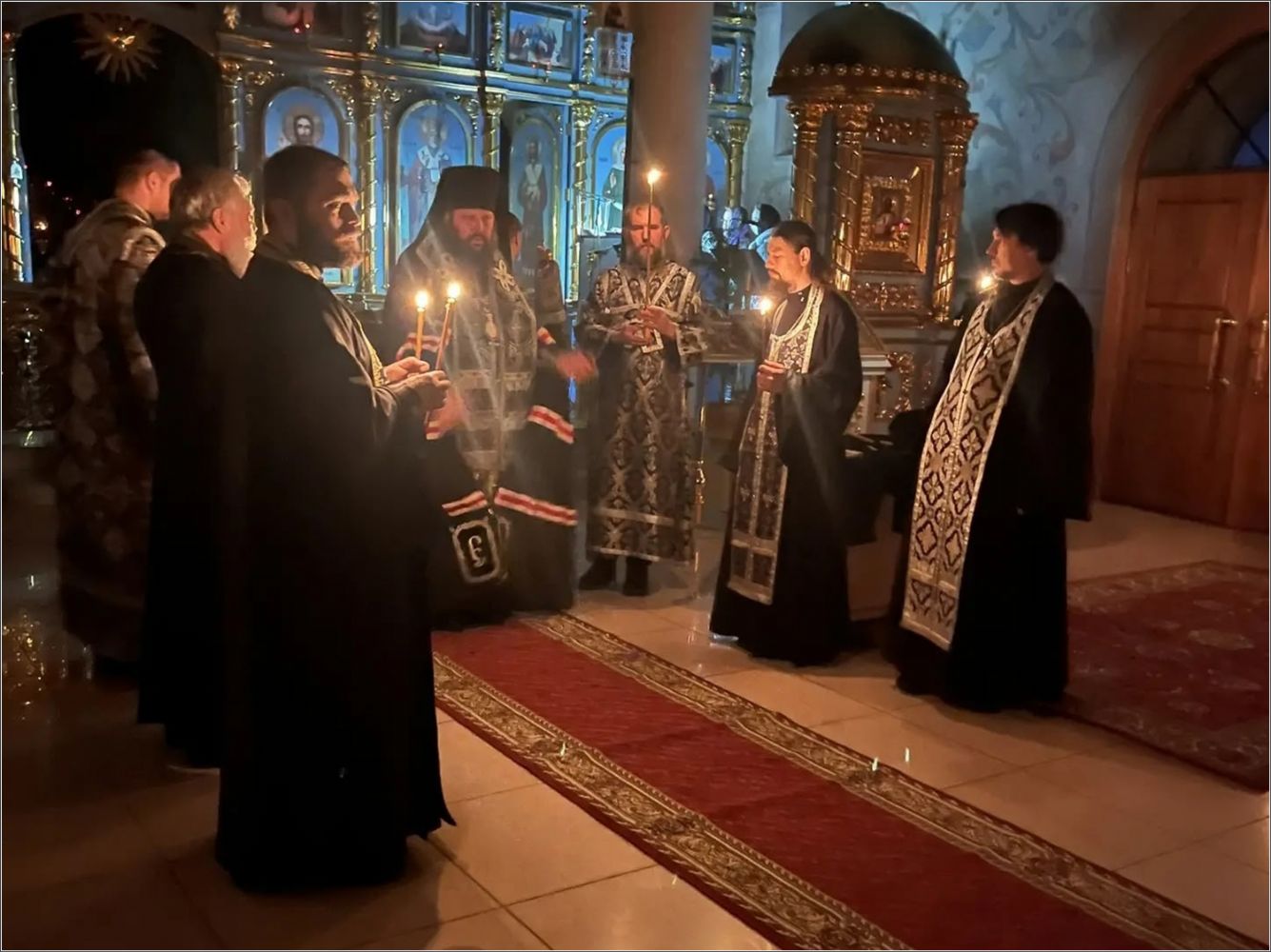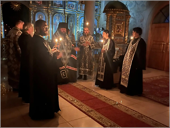 Архипастырю сослужили благочинный Елабужского церковного округа иеромонах Кирилл (Забавнов), благочинный Закамского церковного округа протоиерей Андрей Дубровин, клирики Елабужского монастыря иерей Даниил Кривов и иерей Артемий Танаев, клирик Свято‑Вознесенского кафедрального собора иерей Дмитрий Русин.