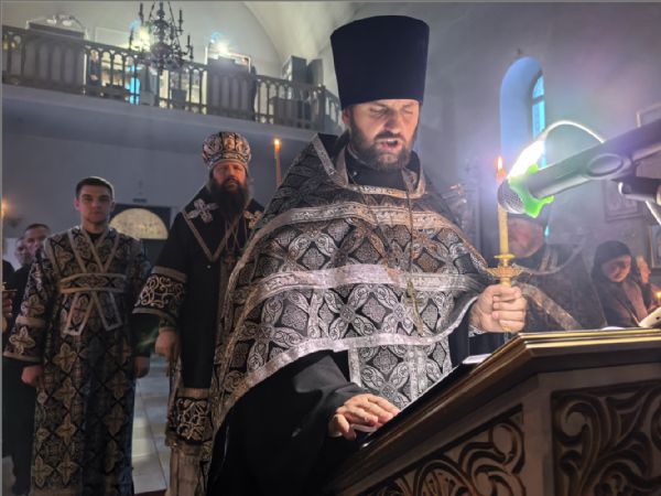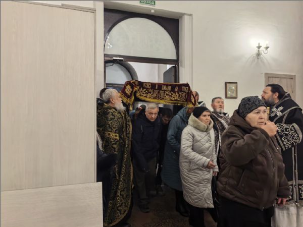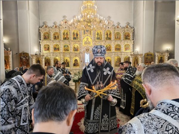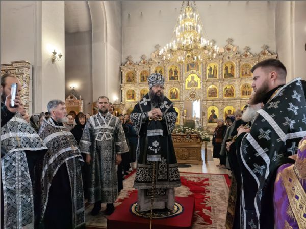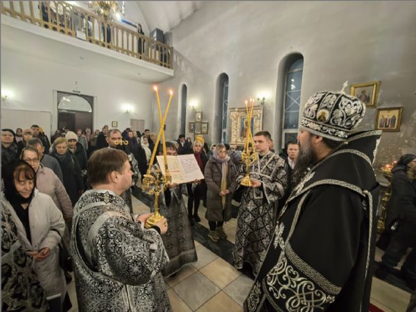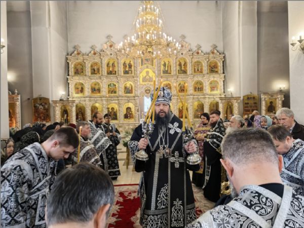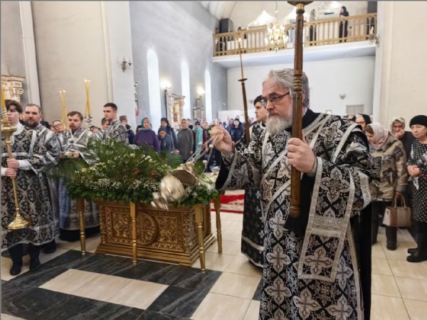 10 апреля 2026 года, в пятницу Страстной Седмицы — день воспоминаний Святых спасительных Страстей Господа нашего Иисуса Христа, епископ Набережночелнинский и Елабужский Гавриил совершил вечерню с чином выноса Святой Плащаницы в храме Казанской иконы Божией Матери города Набережные Челны.