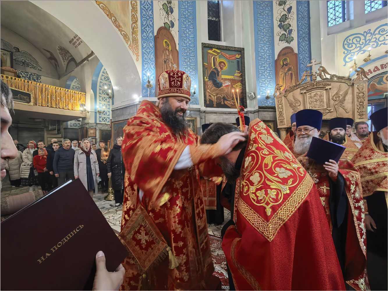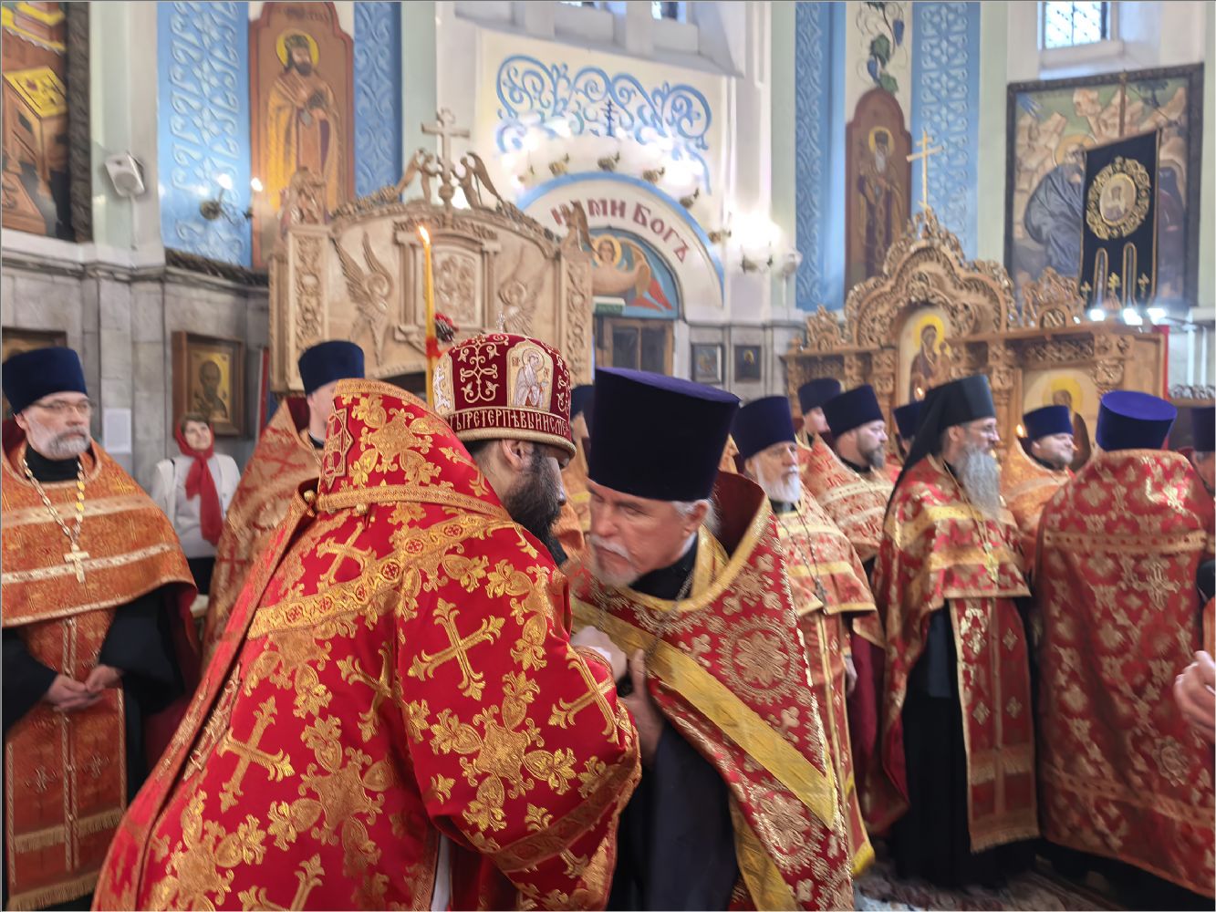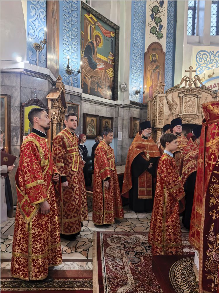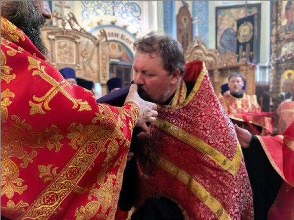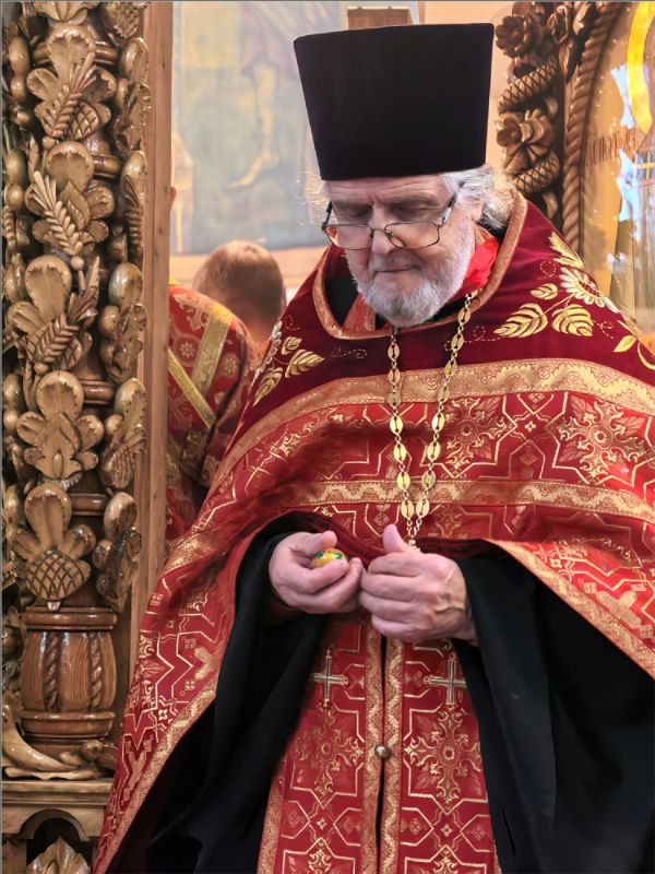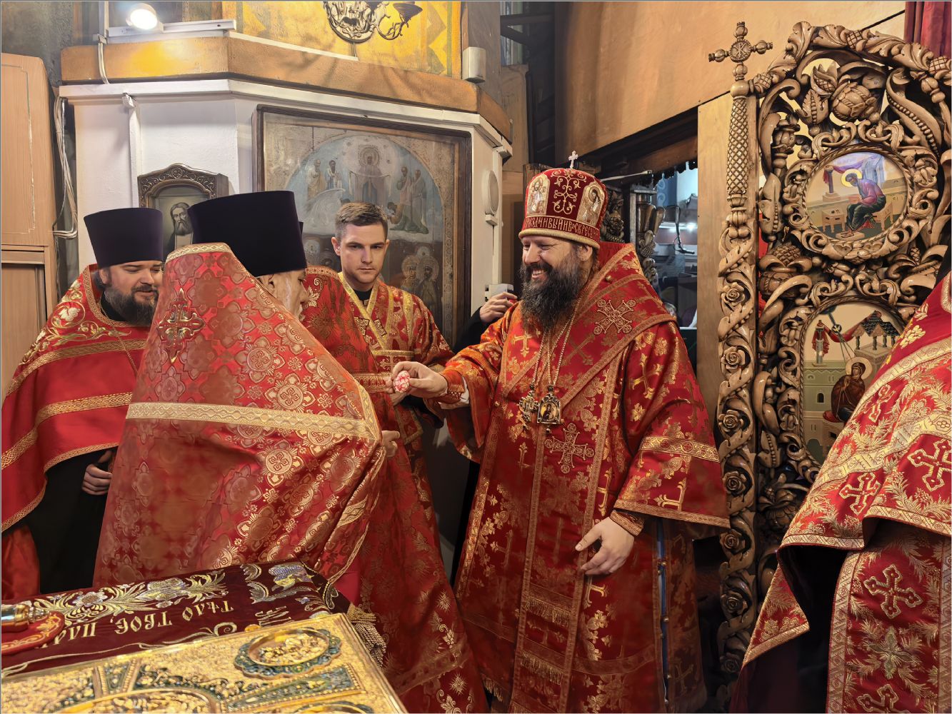 После Стихир Пасхи на вечерне архиерей похристосовался со всеми клириками епархии и подарил каждому расписное Пасхальное яйцо.