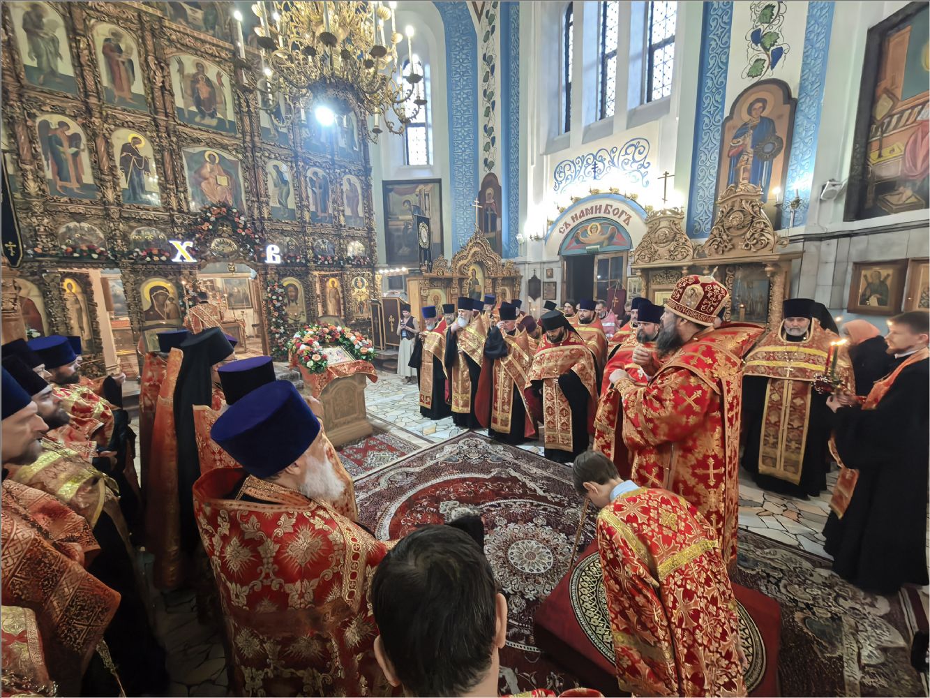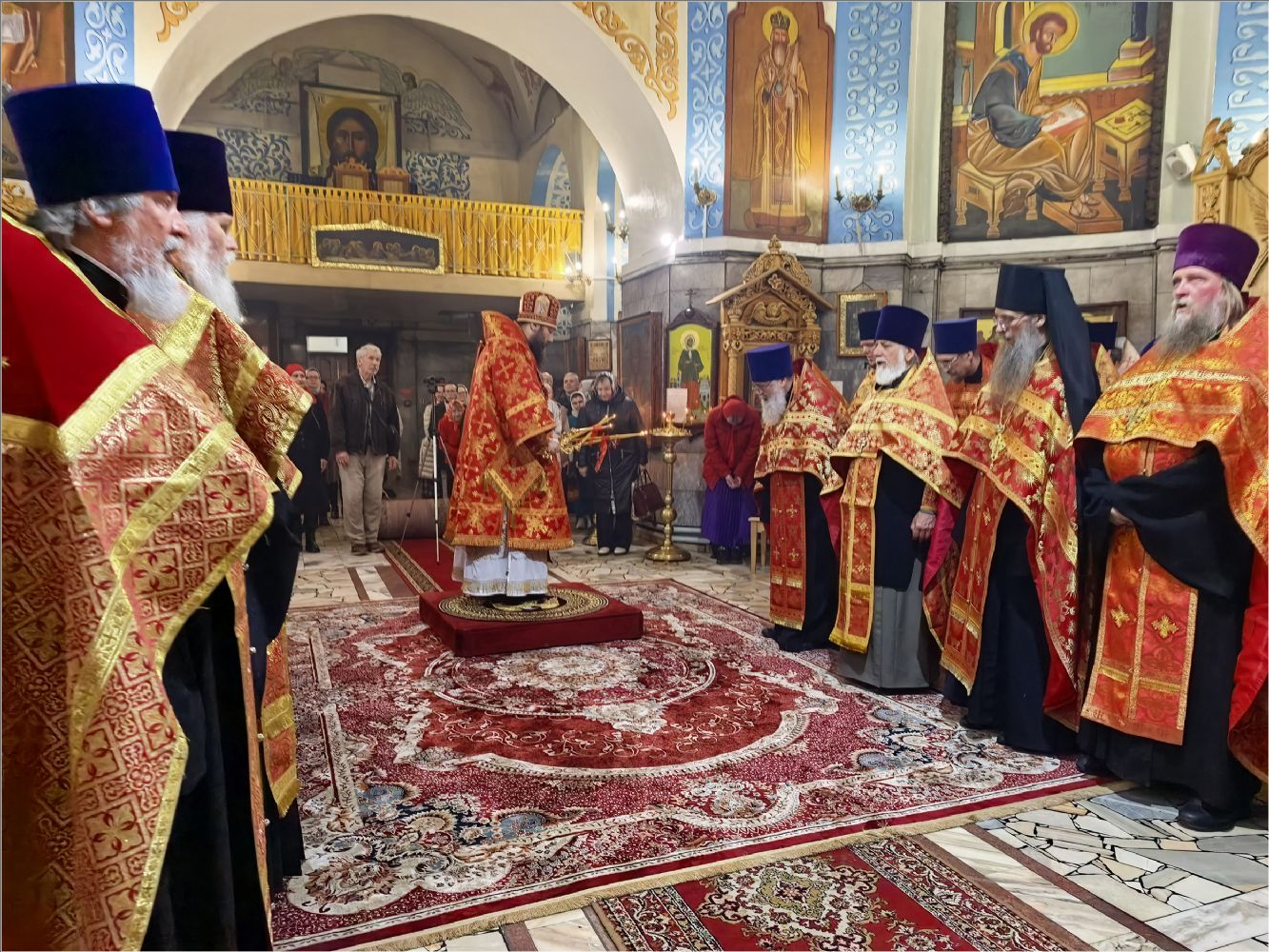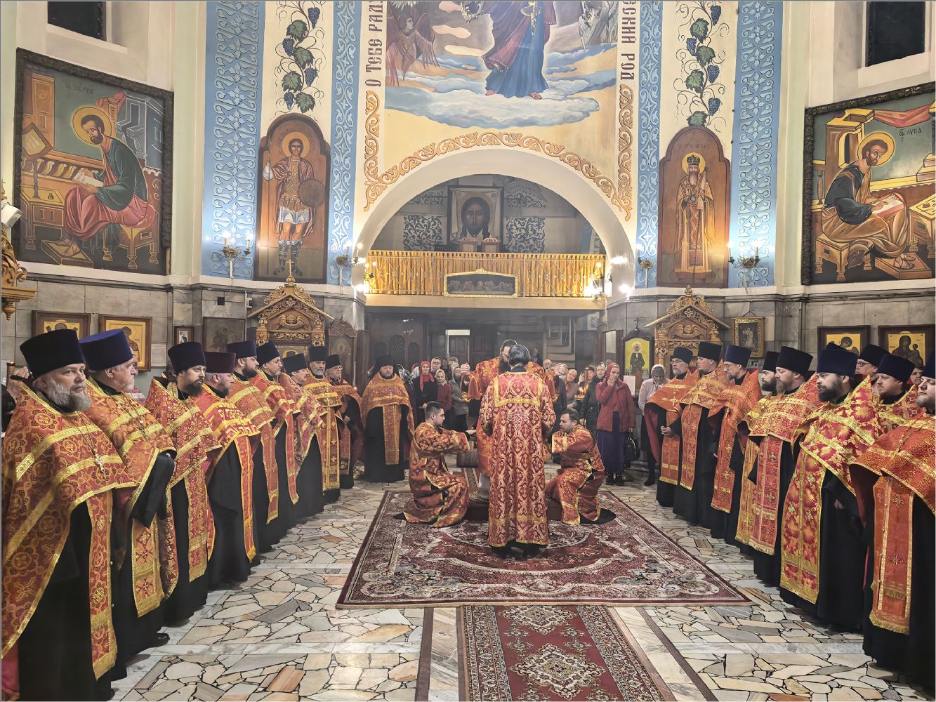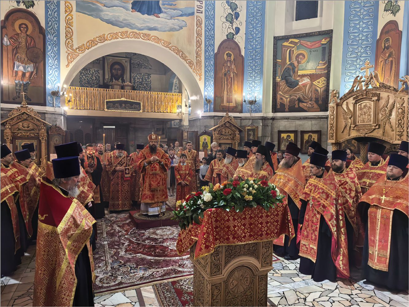 После Стихир Пасхи на вечерне архиерей похристосовался со всеми клириками епархии и подарил каждому расписное Пасхальное яйцо.