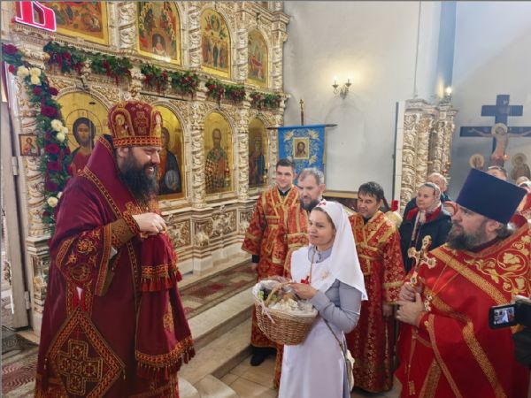 С праздником владыку поздравила старшая сестра милосердия Свято-Елизаветинского сестричества милосердия: «Сердечно поздравляем вас с праздником Святой Пасхи! Радость переполняет наши сердца, когда есть возможность помолиться вместе с вами. От всего сердца желаем вам крепкого здоровья, помощи Божией, покрова Пресвятой Богородицы и заступничества всех святых. Многая лета! Примите, пожалуйста, от нас эту пасхальную корзинку и благословите спеть для вас песню».