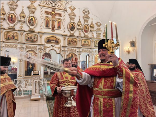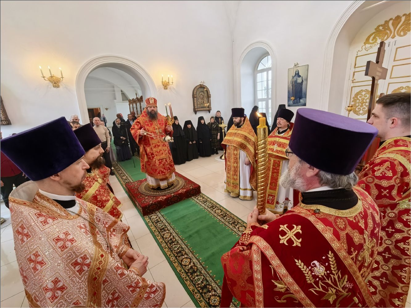 Архипастырю сослужили, благочинный Елабужского округа иеромонах Кирилл (Забавнов), настоятель храма преподобного Серафима Саровского города Набережные Челны иерей Сергий Иноземцев, настоятель храма Илии-Пророка в селе Котловка Елабужского района иерей Евгений Любимов, клирики Елабужского монастыря иерей Даниил Кривов и иерей Артемий Танаев, клирик Свято-Вознесенского кафедрального собора иерей Дмитрий Русин. Диаконский чин возглавил протодиакон Дмитрий Половников. Богослужебные песнопения исполнил архиерейсукий хор под управлением Натальи Гладышевой.