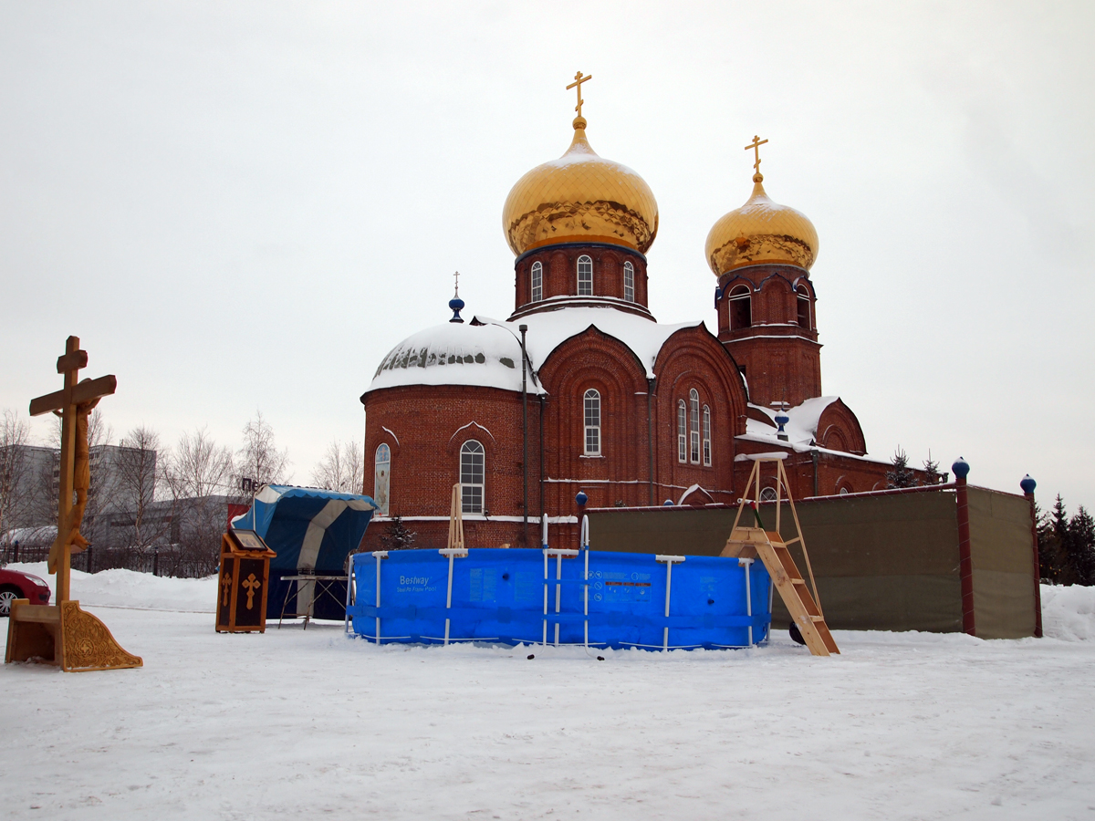 После водосвятного молебна все желающие смогут набрать крещенской воды. Кроме того, в этом году все желающие смогут погрузиться в специально устроенный для купания бассейн во дворе храма. Рабочими храма были сделаны раздевалки из тента.