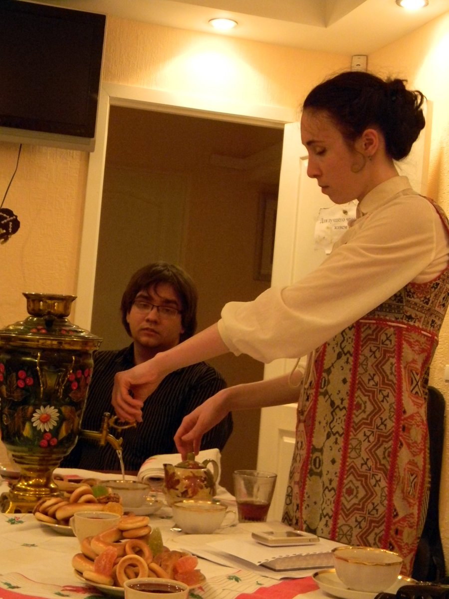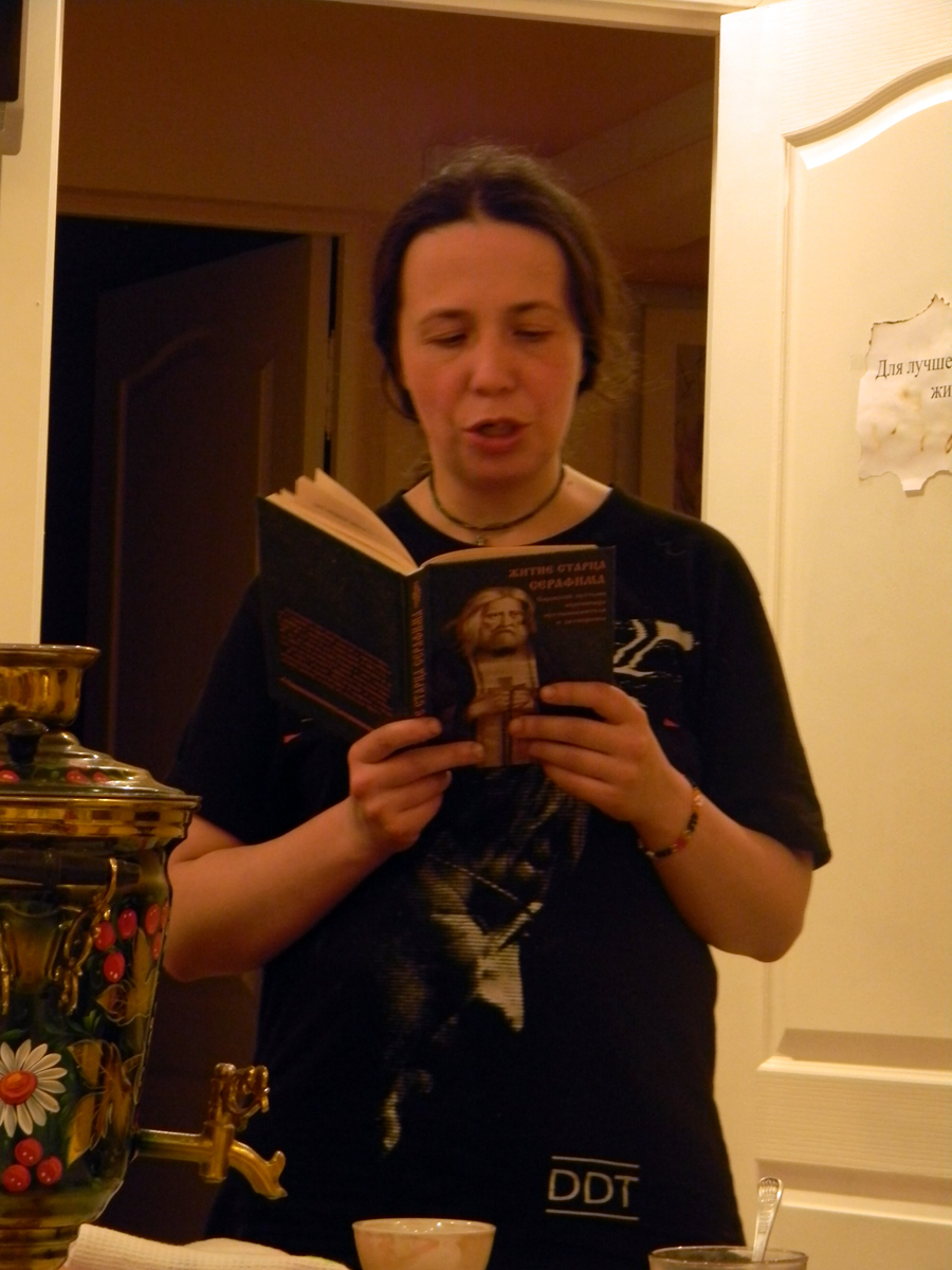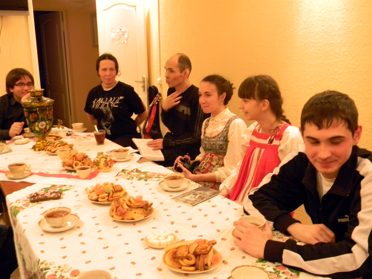 Самовар, бублики, русские народные костюмы и, конечно, книги – необходимые атрибуты этого вечера. Все для того, чтобы передать древнерусскую атмосферу XVI века. На вечер ребята пришли не с пустыми руками, почти каждый принес с собой любимые книги и знакомил с ними публику, желающие могли обменяться. Из представленных книг: «Богомолье» Ивана Шмелева, «Как жить по Евангелию» архиепископа Иоанна Шаховского, «Несвятые святые» архимандрита Тихона Шевкунова, – у каждого из ребят, помимо Священного Писания, она своя, любимая книга. Важно, что в потоке информационных технологий православная книга все так же актуальна и продолжает заполнять книжные полки христиан. Часто одна такая книга может привести человека к Богу, помочь в деле спасения души. Не зря преподобный Исаак Сирин говорил: «Если прекратить хотя ненадолго частое чтение Божественных Писаний, то увлекается человек в страсти».