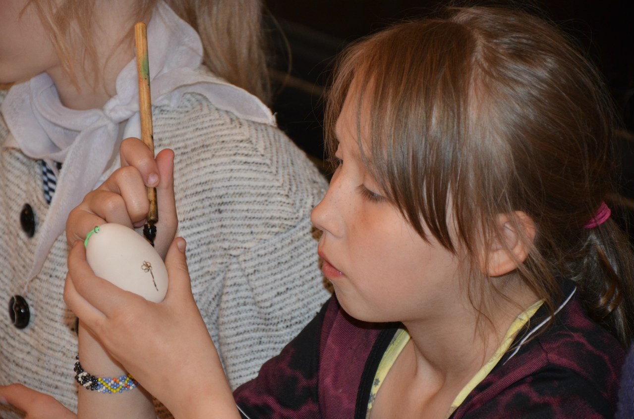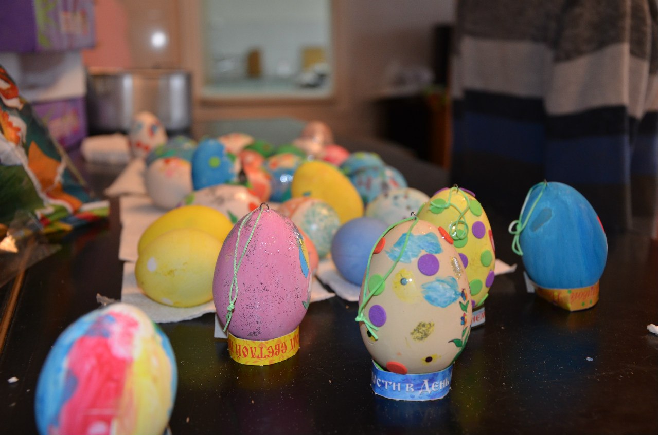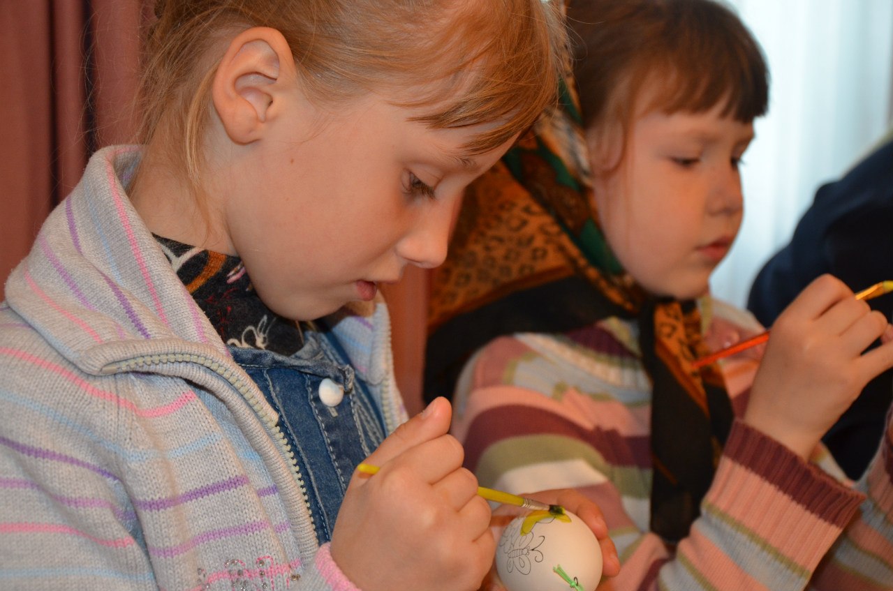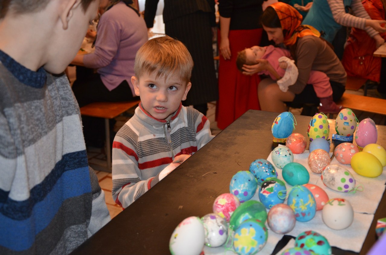 Роспись яиц красками, воском, с использование наклеек; яйца обычные, яйца фарфоровые — все это было сегодня в центре внимания. Росписью увлеклись все: от младенцев и их родителей до учителей Воскресной школы. Особый шик дня — роспись воском. Перегреешь воск — жирная капля, недодержишь на огне — тоже ничего хорошо. Этим мастерством овладели не все, зато все попробовали. В итоге среди пестрого разнообразия конкурсных яиц определить лучшее стало невозможным.