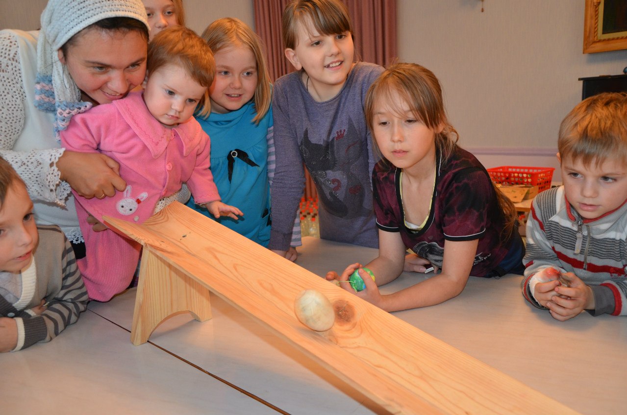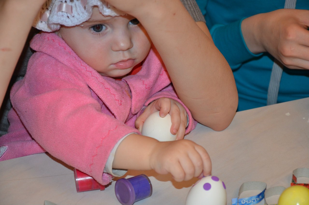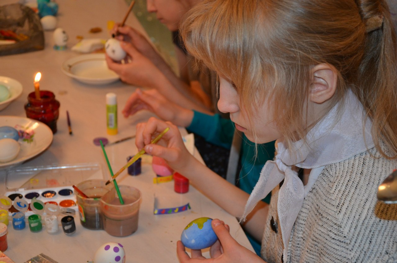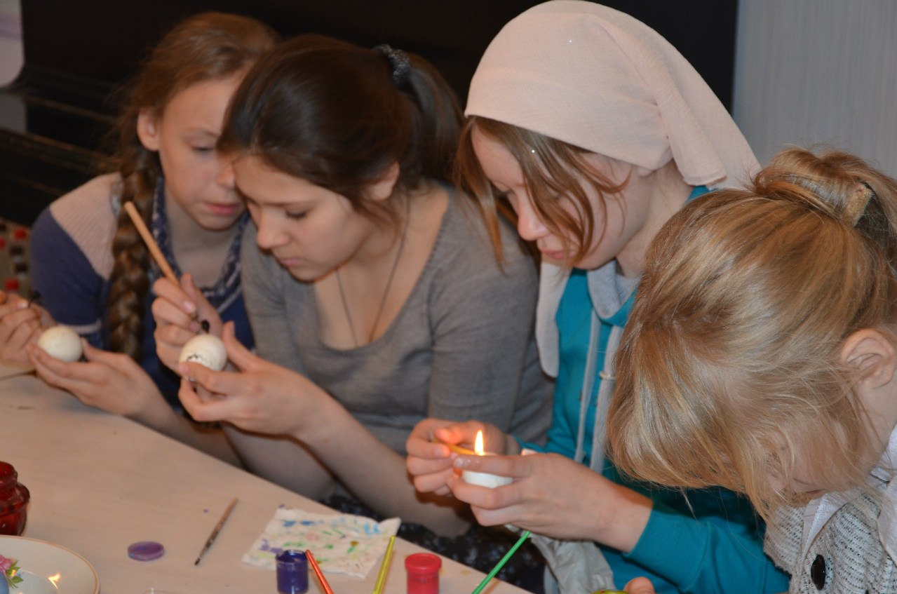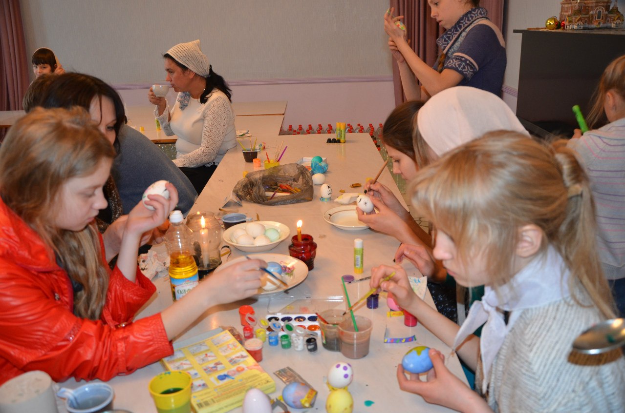 Роспись яиц красками, воском, с использование наклеек; яйца обычные, яйца фарфоровые — все это было сегодня в центре внимания. Росписью увлеклись все: от младенцев и их родителей до учителей Воскресной школы. Особый шик дня — роспись воском. Перегреешь воск — жирная капля, недодержишь на огне — тоже ничего хорошо. Этим мастерством овладели не все, зато все попробовали. В итоге среди пестрого разнообразия конкурсных яиц определить лучшее стало невозможным.