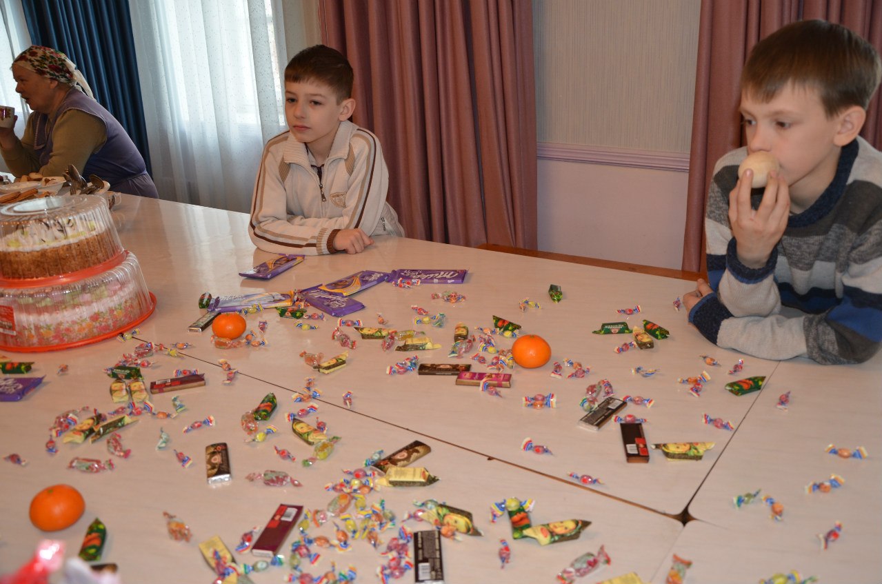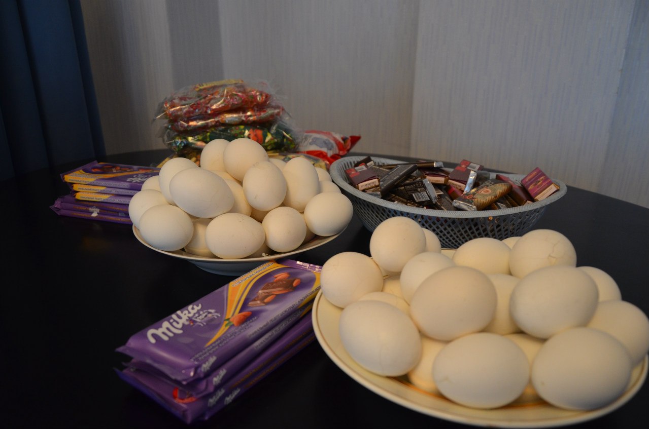 Призы разыгрывали катанием яиц с горки. Перед горкой на столе разложили конфеты, плитки шоколада и — главный приз — торт. После розыгрыша шоколад и конфеты затерялись в карманах участников, а вот торт съели все вместе за чаем.