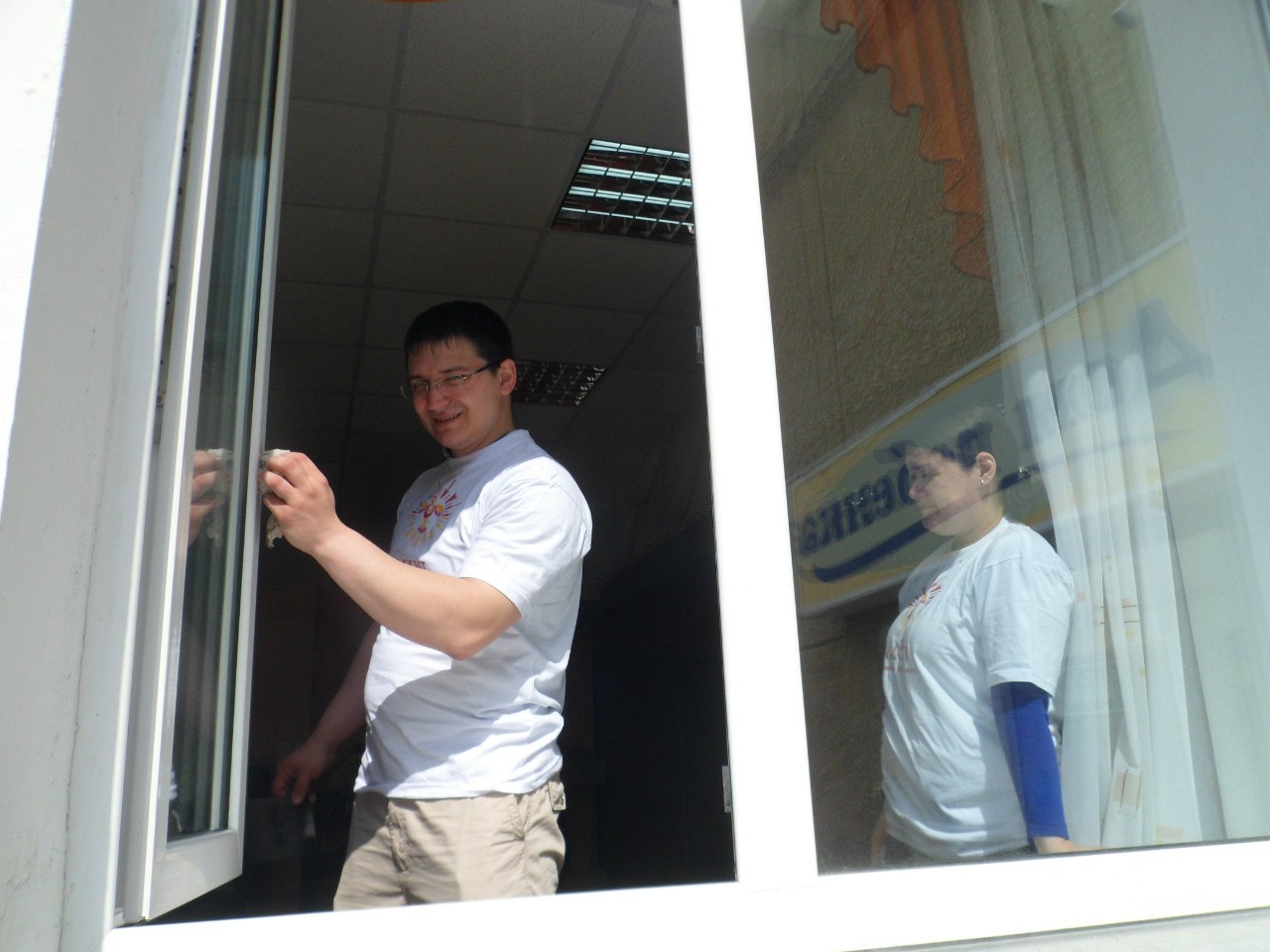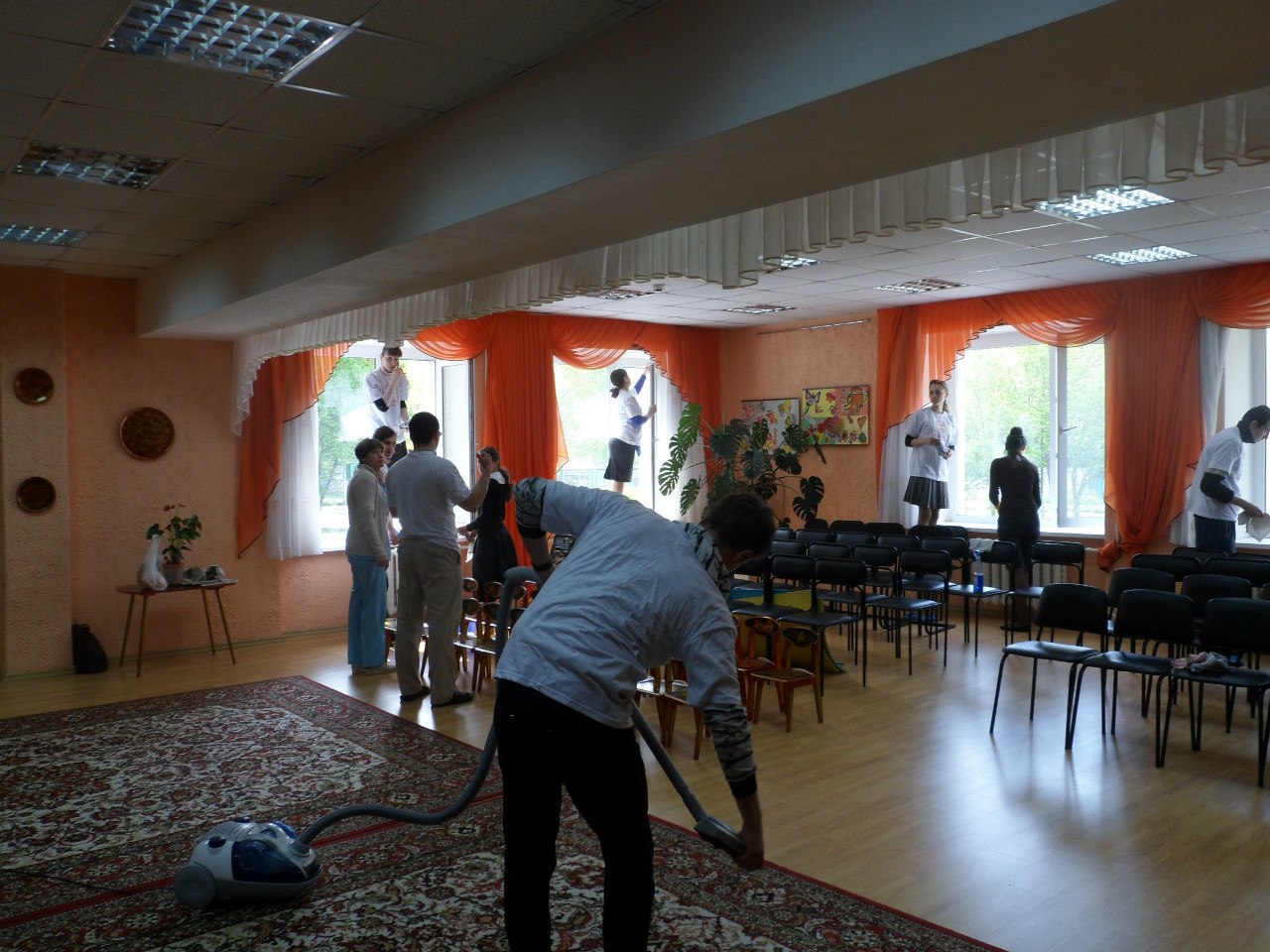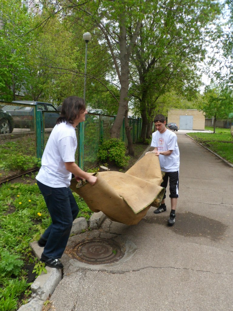 В понедельник 7 мая состоялся очередной трудовой десант православной молодежной группы «Рассвет» Свято-Вознесенского Архиерейского подворья в «Доме ребенка», расположенном в 54 комплексе. Как обычно все собравшиеся подождали распределения работ со стороны завхоза и старшей сестры-хозяйки, после чего приступили к выполнению полученных заданий по уборке здания и веранд на территории. Молодёжные активисты мыли окна и протирали пыль, особое внимание уделялось батареям на тыльной стороне которых за зиму скопилось большое количество пыли, пропылесосили ковры и паласы. Затем ребята и девушки принялись за уборку прогулочных веранд и территории возле них, протёрли влажными тряпками «грибки» на песочницах. При уборке одной из веранд, был обнаружен ковёр, который было решено вытрясти. Полы веранд были также вымыты с особой тщательностью прекрасной половиной молодёжной группы «Рассвет», в этом им помогали и парни.