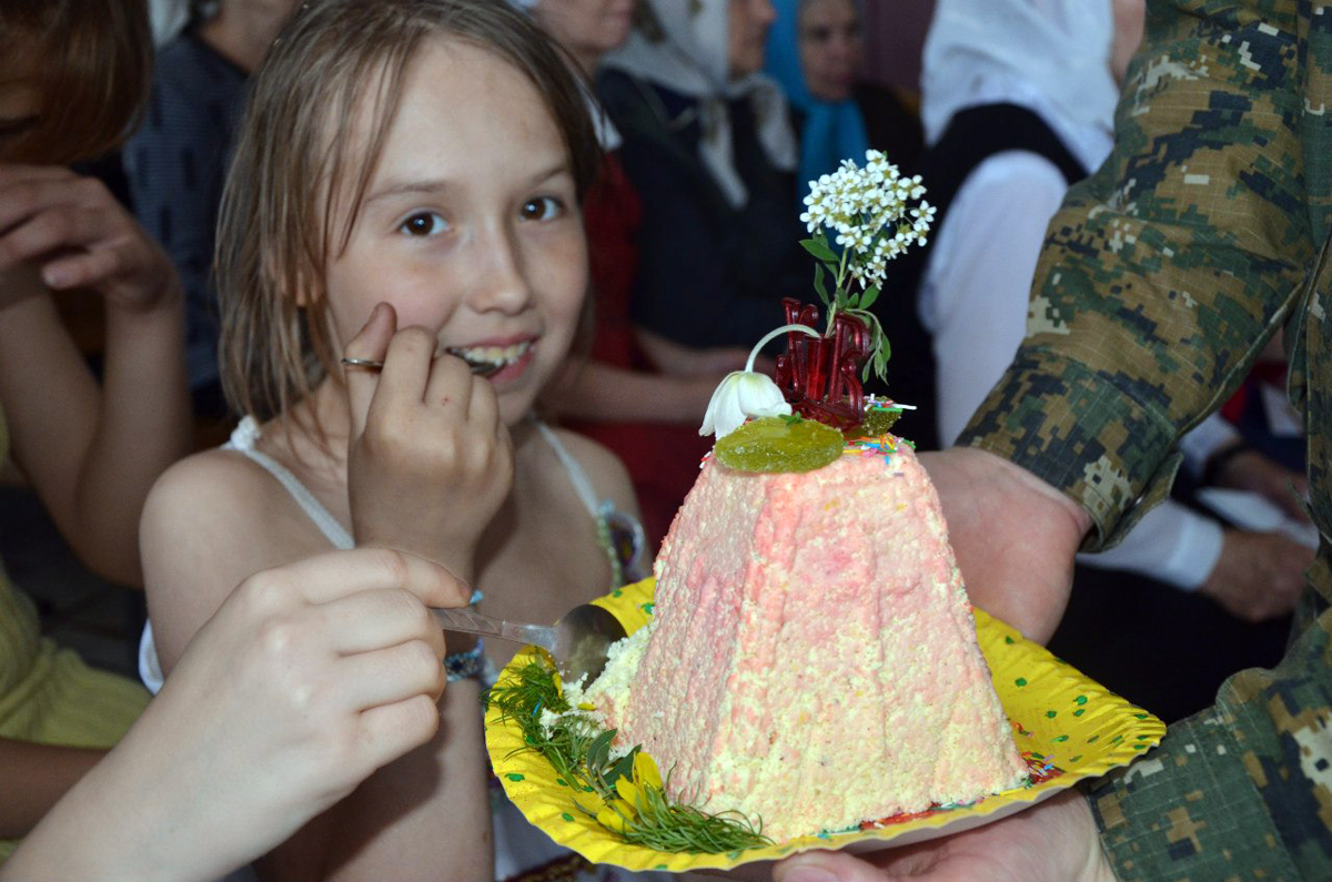 В продолжении — конкурс на лучшую творожную пасху. Объявил о нем настоятель протоиерей Олег Богданов. Но перед началом еще раз поздравил ветеранов и обратился к молодежи: «Учите историю, главное — не забывать». Певчих, как и ветеранов, настоятель поблагодарил отдельно: «Они нам молиться в храме помогают, а здесь душу радуют». После этого весь зал, вооружившись ложками, дегустировал конкурсные сладости.