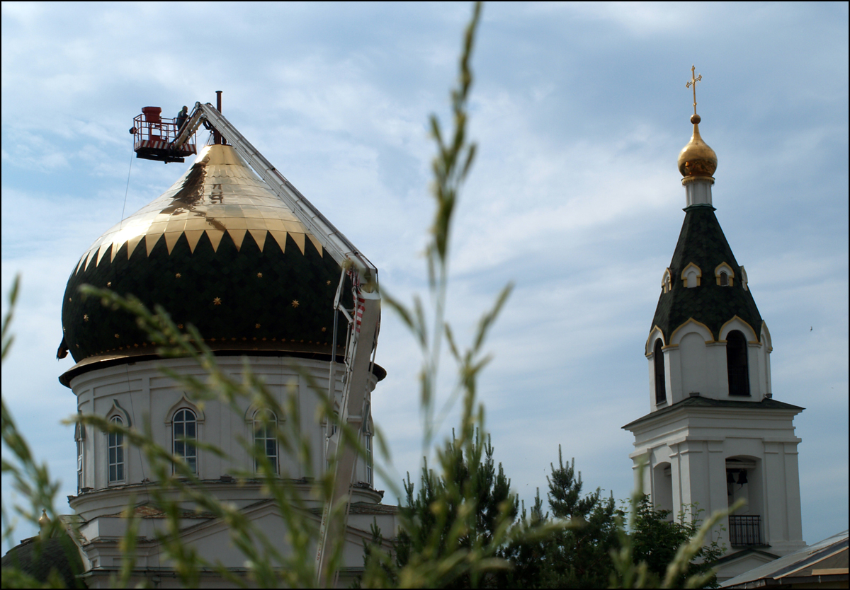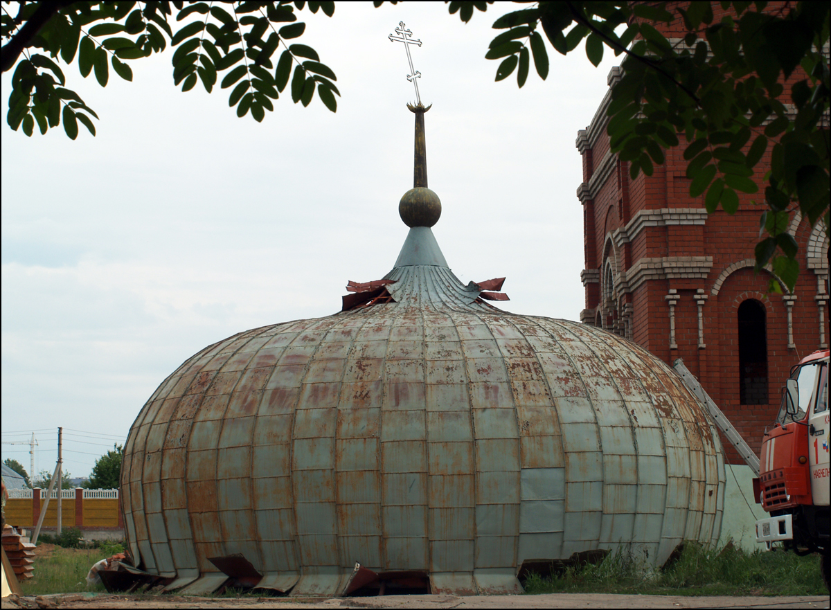 Напомним, что изготовление нового купола началось еще несколько лет назад, заменить старую 20-летнюю маковку хотели еще на 150-летний юбилей. Первоначально был изготовлен каркас, который долгое время стоял во дворе храма – новый купол получился по весу немного больше, чем могут выдержать стены. В связи с этим велась работа по его облегчению, изучению стен, фундамента.