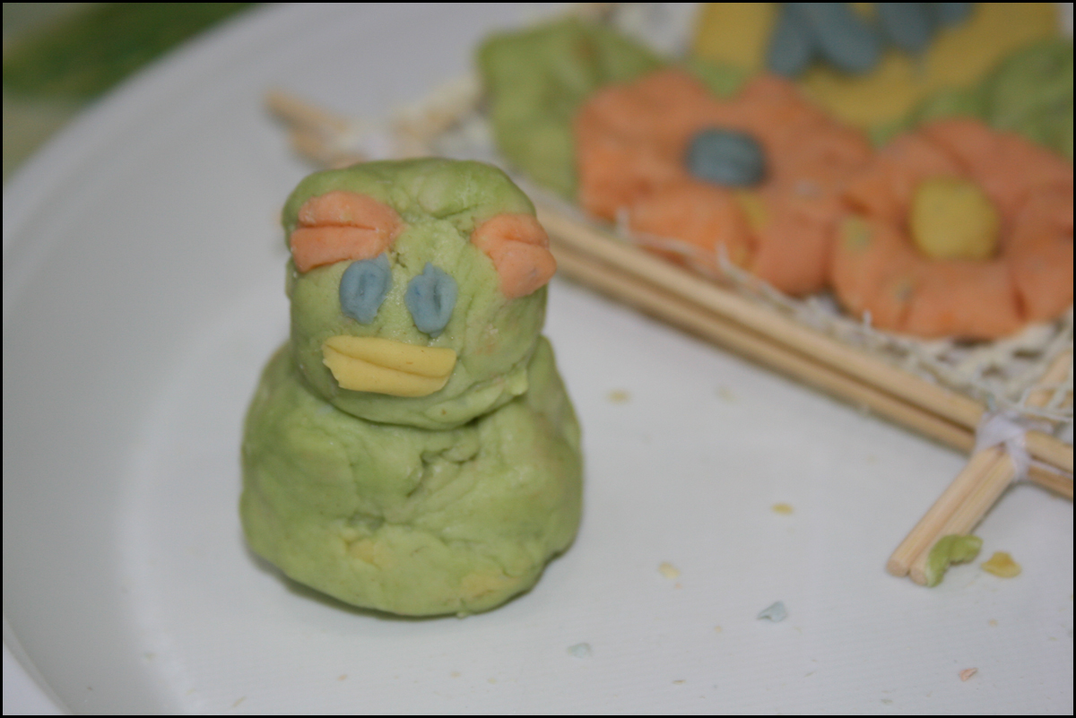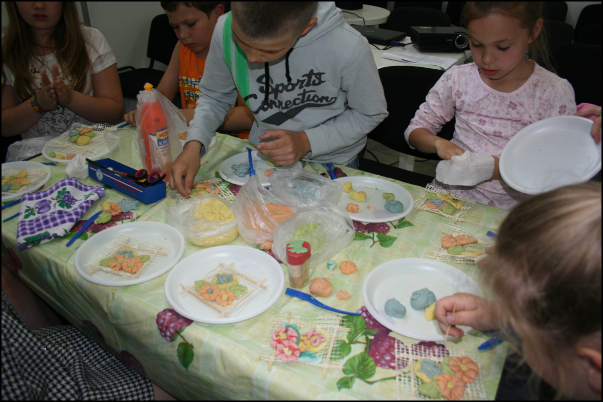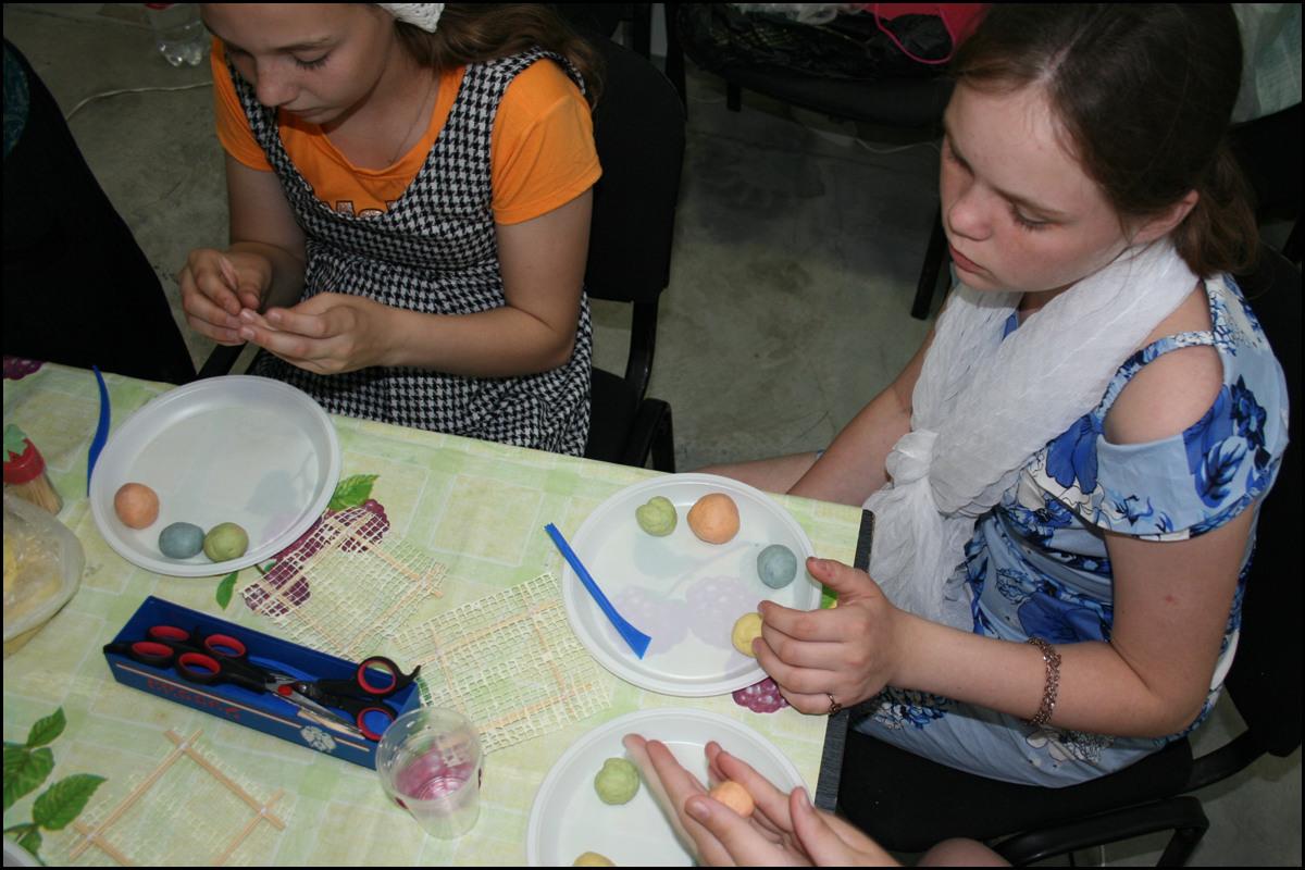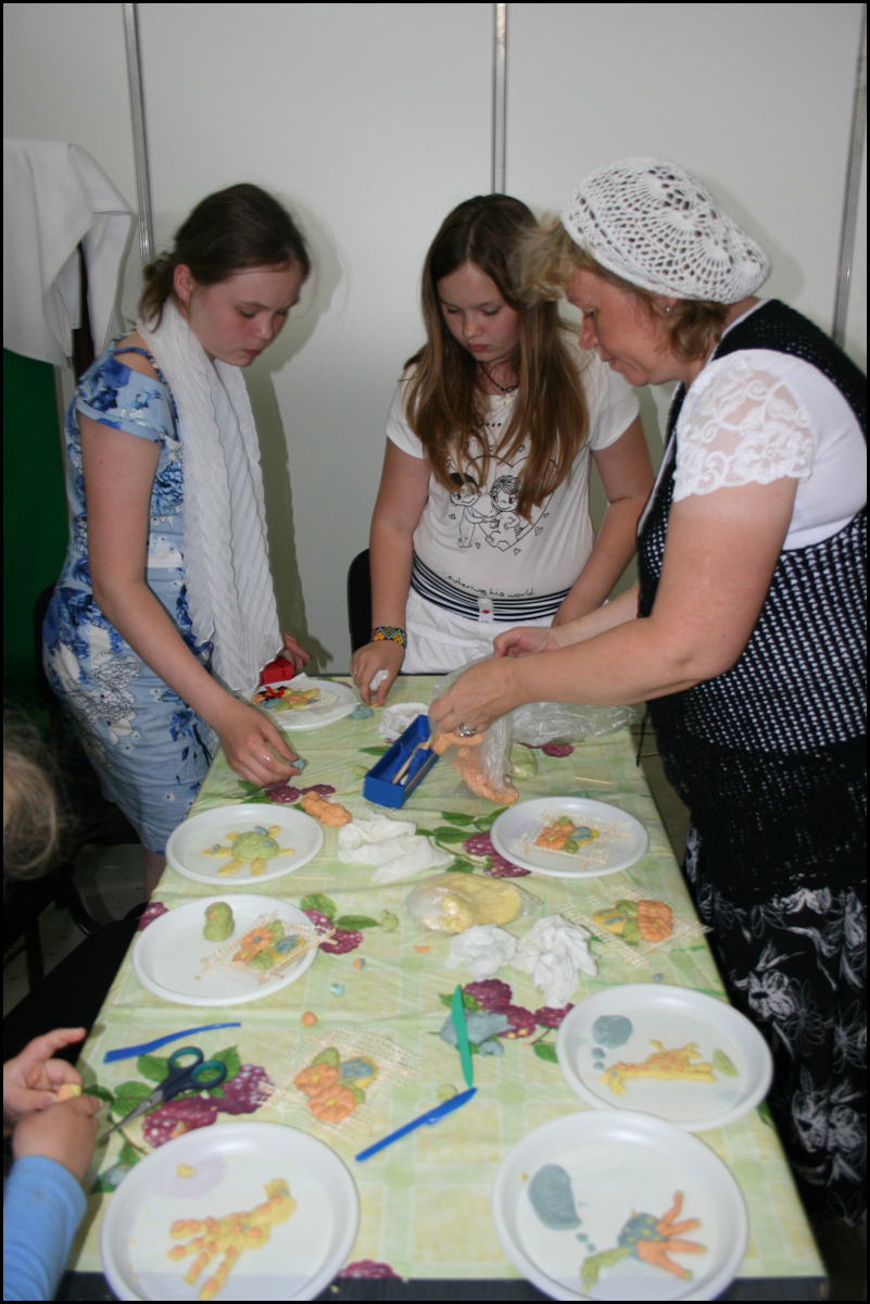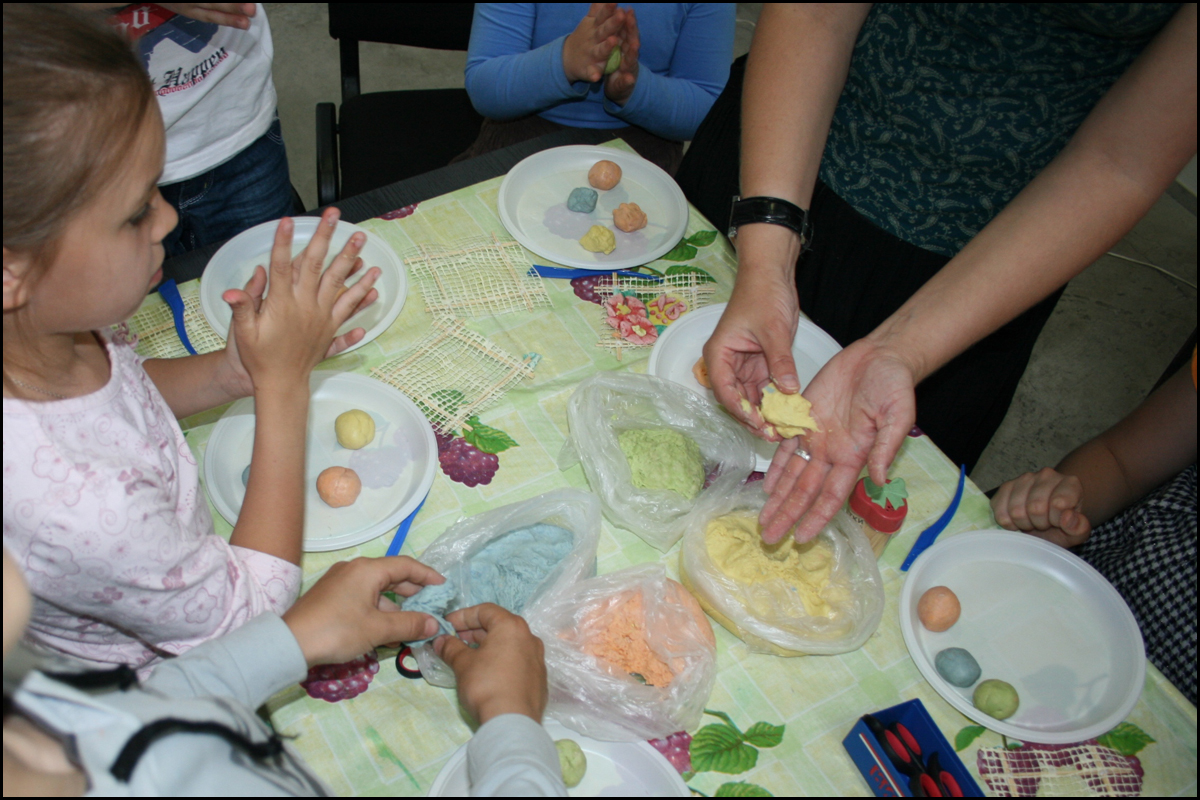 Вторая беседа посвящалась празднику Пасхи, в ходе которой детям был дан мастер-класс по лепке из соленого теста. По заданию педагога дети вылепили композицию на Пасхальную тему. А остатки теста ушли на реализацию творческой энергии детей. Кого только не налепили: черепахи, жирафы, динозавры!