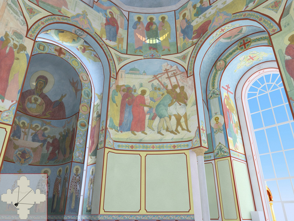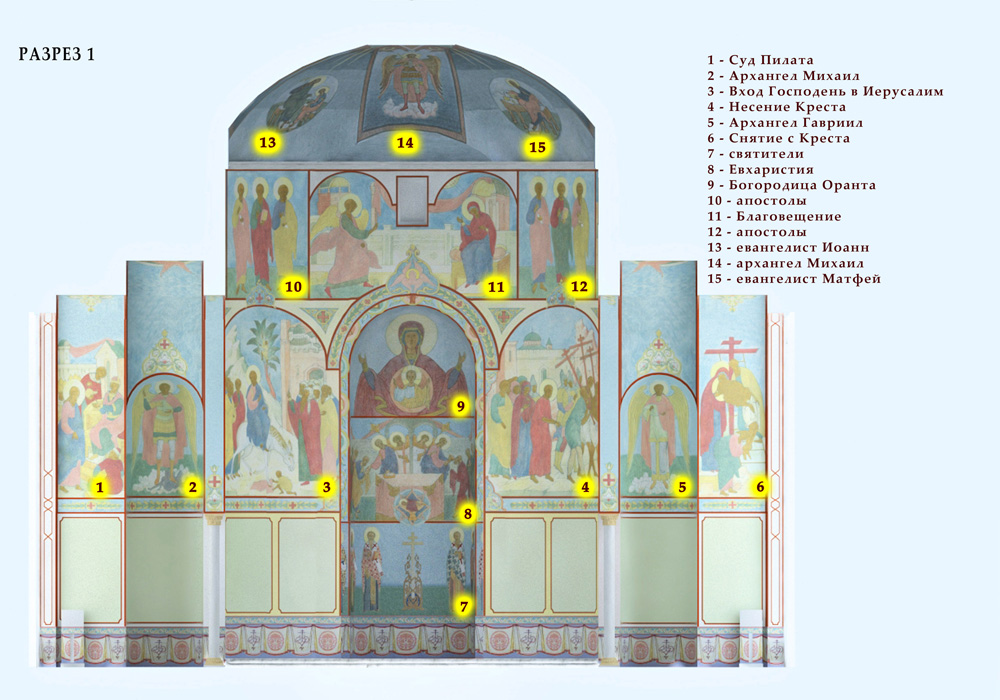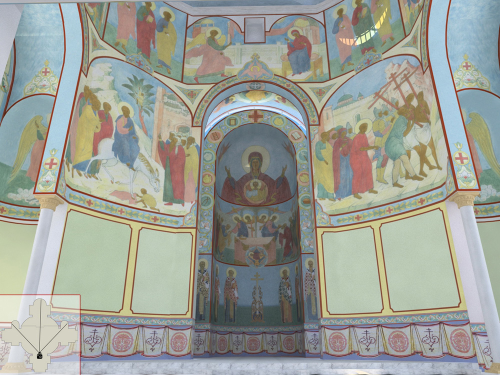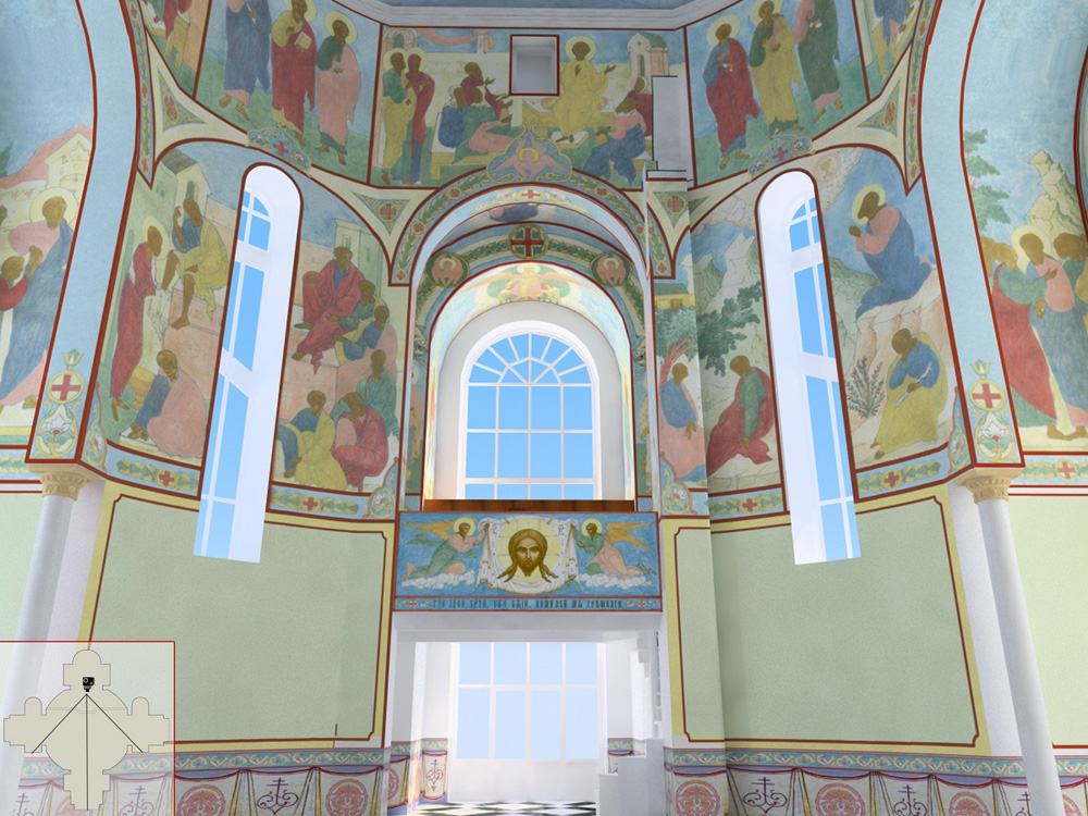 Работы будут проходить поэтапно. Сначала снятие старой штукатурки и подготовка стен, затем наложение новой, выравнивание и наложение специального грунта под роспись, перенесение эскиза в натуральную величину на все стены храма, и наконец поэтапная роспись, с покрытием больших объемов краской, росписью больших форм и в завершении более мелкая роспись деталей, ликов, надписей, мелких деталей одеяния святых, орнаментов. Работа по росписи всегда выполняется специалистами от общего к частному.