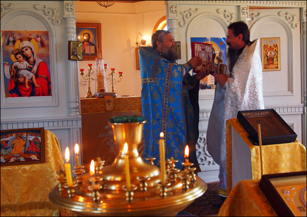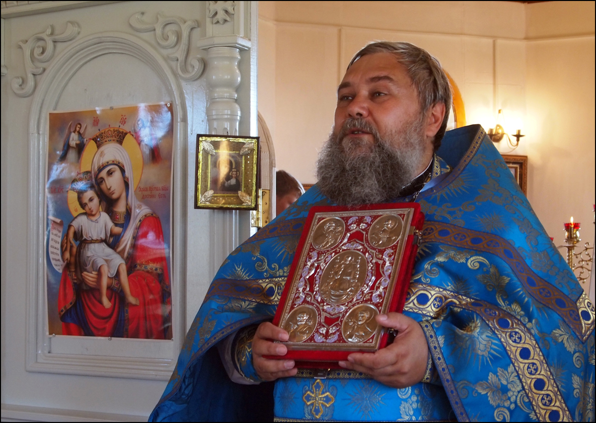 После окончания богослужения о. Андрей поздравил с престольным праздником настоятеля и прихожан Владимирской церкви и в своей проповеди заметил, что «более великого посредника, чем Пресвятая Богородица, мы найти не можем. Когда Господь умирал на Кресте, Он всех нас усыновил Богородице через апостола Иоанна: «Жено, се чадо твое», – сказал Он Ей. Вот и мы все тоже являемся чадами Пресвятой Богородицы. И поэтому, стоит нам только с сокрушением воззвать: «Мати Божия, помоги!», Она тут же являет нам свою помощь, наша Заступница». Благочинный преподнес в дар храму книгу «Апостол» в богослужебном переплете. Отец Владимир в свою очередь обратился с ответным словом, поблагодарил благочинного за возможность сослужить ему эту праздничную службу и преподнес в дар благочинному икону Кирилла и Марии Радонежских.