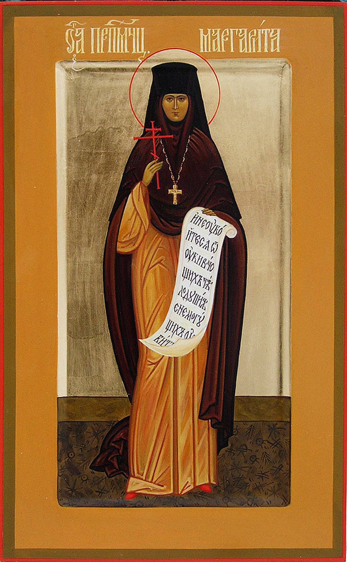 В начале ХХ века преподобномученица Маргарита была настоятельницей Пророко-Ильинского женского монастыря города Мензелинск, Уфимской губернии. По происхождению гречанка, умная и образованная, настоятельница святой обители славилась своей строгой аскетической жизнью и устроением жизни монастырской в духе древнего благочестия. Святая Маргарита равно заботилась и о внешнем благоустроении обители и о внутреннем духовном мире насельниц монастыря. Своим трудом и с помощью Божией она очень умело поставила монастырское хозяйство: монастырь имел фруктовые сады, огороды, пасеки, мастерские: иконописную, златошвейную - и даже фотолабораторию (что по тем временам было чрезвычайно редко).