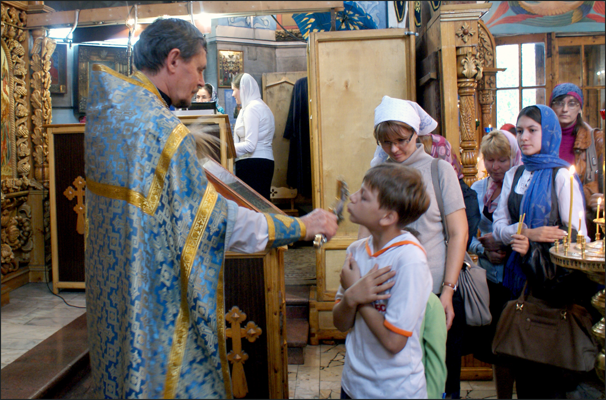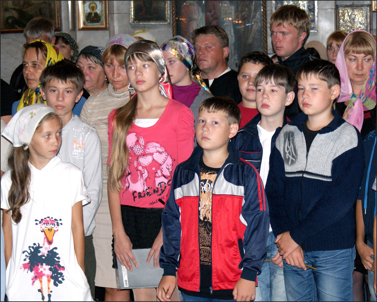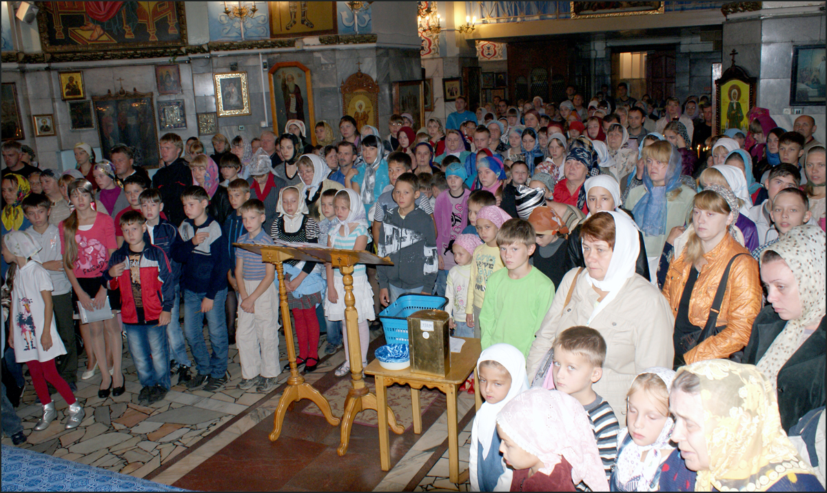 30 августа Свято-Вознесенский собор был полон маленьких прихожан: взъерошенные головы мальчишек и девчонок в белых чистеньких платочках старательно кланялись под напев молитв. Такое не часто увидишь в храмах, ведь чаще всего приходят на богослужения люди, умудренные опытом. Но не в этот день, ведь в Свято-Вознесенском Архиерейском подворье уже стало доброй традицией служить молебен с благословением учащихся на новый учебный год в выходной день перед первым сентября.