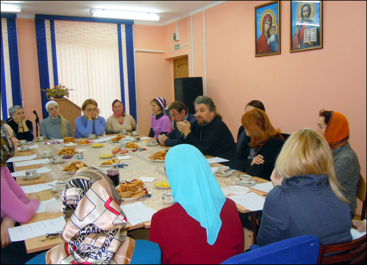 Началась встреча со вступительного слова отца Евгения, который поделился с присутствующими основными целями данного мероприятия: создание тесно сплоченной общины, чтобы помогать «своими идеями и действиями не только на нашем приходе, но и городе». Встречи предполагают общение со священником в непринужденной обстановке, знакомство прихожан между собой, введение прихожан в курс дел и событий нашего прихода.