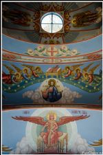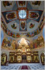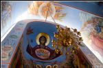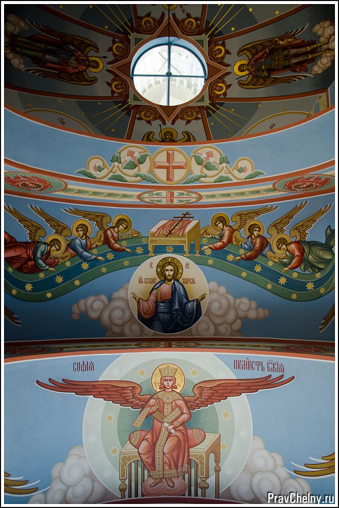 Сказать, что роспись очень красива — ничего не сказать. Выполненная в традициях классической иконописи, настенная живопись не просто восхищает благородной цветовой гаммой, каноничностью техники и мастерством исполнения. Когда поднимаешь взор на небесно-синий свод с россыпью золотых звезд, кажется, будто дух молитвенно возносится к самому Престолу Божию, у которого торжественным сонмом предстоят все Небесные силы — по четырем сторонам света Архангелы стоят на страже мира. События евангельской истории и образы святых пребывают на стенах по всему периметру храма.