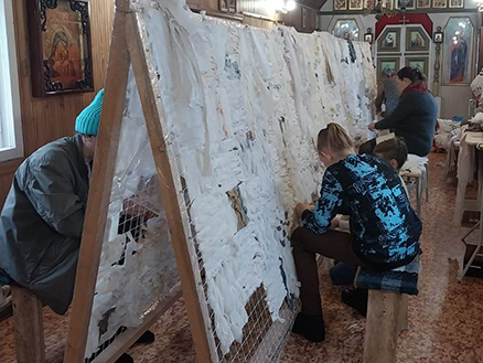 В храме великомученика Георгия Победоносца плетут сети для маскировки техники и военнослужащих в зоне СВО