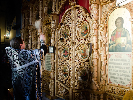 На минувшей неделе в Свято-Вознесенском соборе был совершен чин освящения икон нового иконостаса. Клирик собора иерей Валерий Матвеев прочитал специальные молитвы и окропил иконы святой водой.