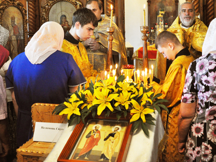 12 июля в храме преподобного Серафима Саровского прошла праздничная Литургия. Перед службой был прочитан акафист апостолам. Несмотря на будний день, храм был полон прихожан, пришедших почтить память святых первоверховных апостолов Петра и