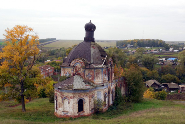 Небольшая сельская церковь в псевдорусском стиле, выделяющаяся выразительной постановкой на рельефе. Церковь имеет симметрично-осевую композицию. Храмовая часть – двусветный четверик со срезанными углами под сомкнутым восьмигранным сводом с четырьмя люкарнами в основании. Маленькая главка посажена на глухой круглый барабан. Апсида пятигранная, с окнами на каждой грани, трапезная в два окна. Все входы и оконные проемы имеют арочную форму, в простенках пилястры. Колокольня утрачена.