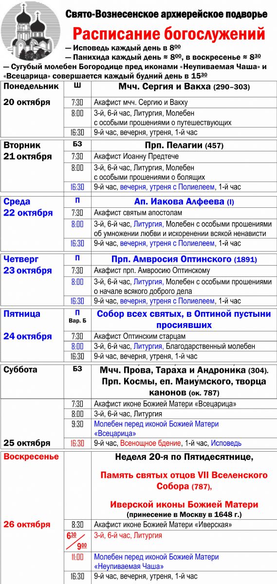Расписание богослужений с 20 по 26 октября 2025 года:
