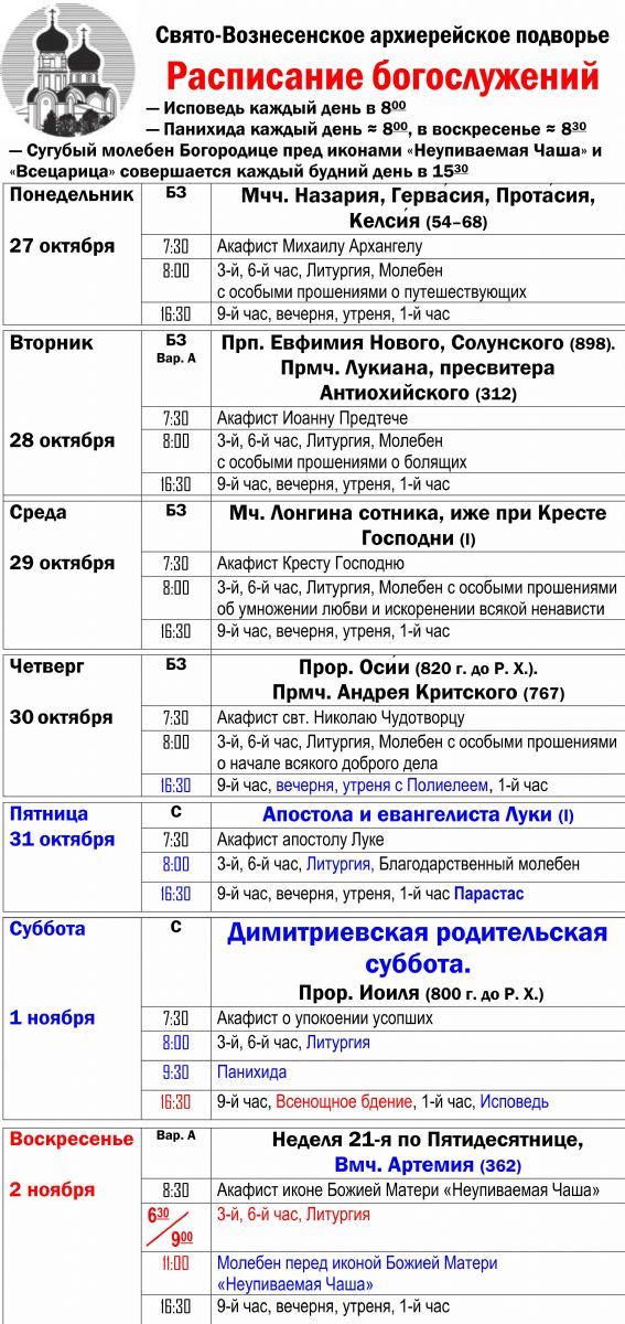 Расписание богослужений с 27 октября по 2 ноября 2025 года: