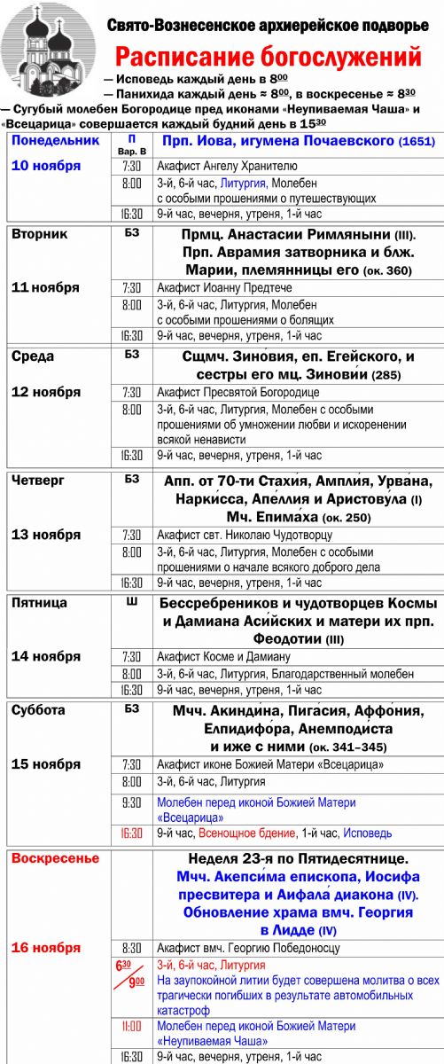 Расписание богослужений с 10 по 16 ноября 2025 года:
