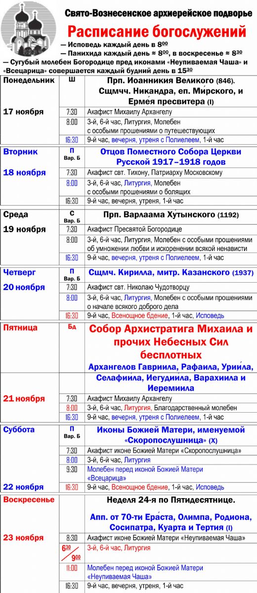 Расписание богослужений с 17 по 23 ноября 2025 года: